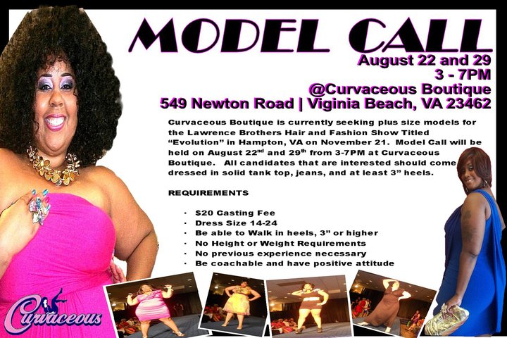 Curvaceous Boutique is currently seeking plus size models for the Lawrence Brothers Hair and Fashion Show Titled “Evolution” in Hampton, VA on November 21. Model Call will be held on August 22nd and 29th from 3-7PM at Curvaceous Boutique. All candidates that are interested should come dressed in solid tank top, jeans, and at least 3’’ heels.