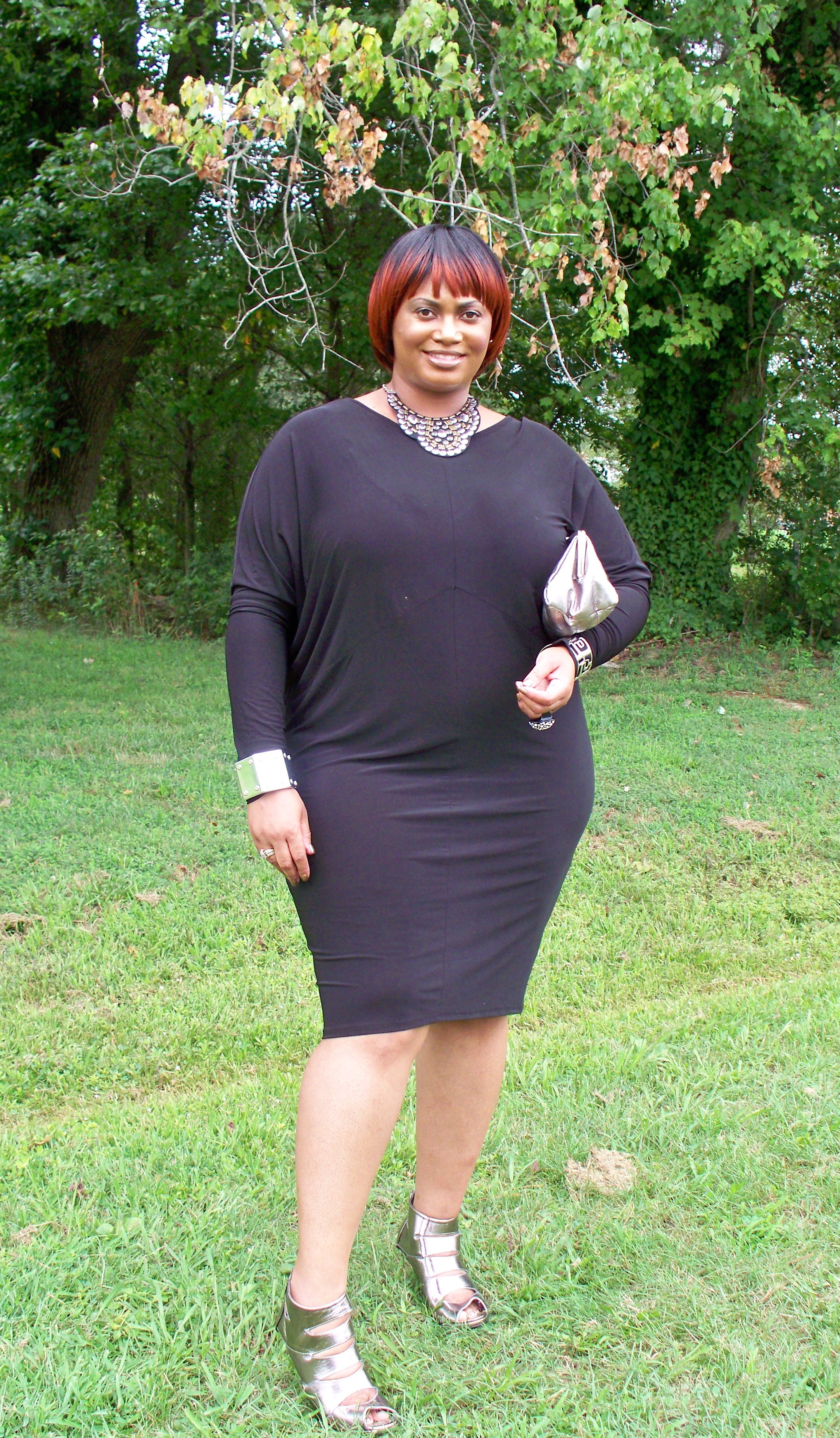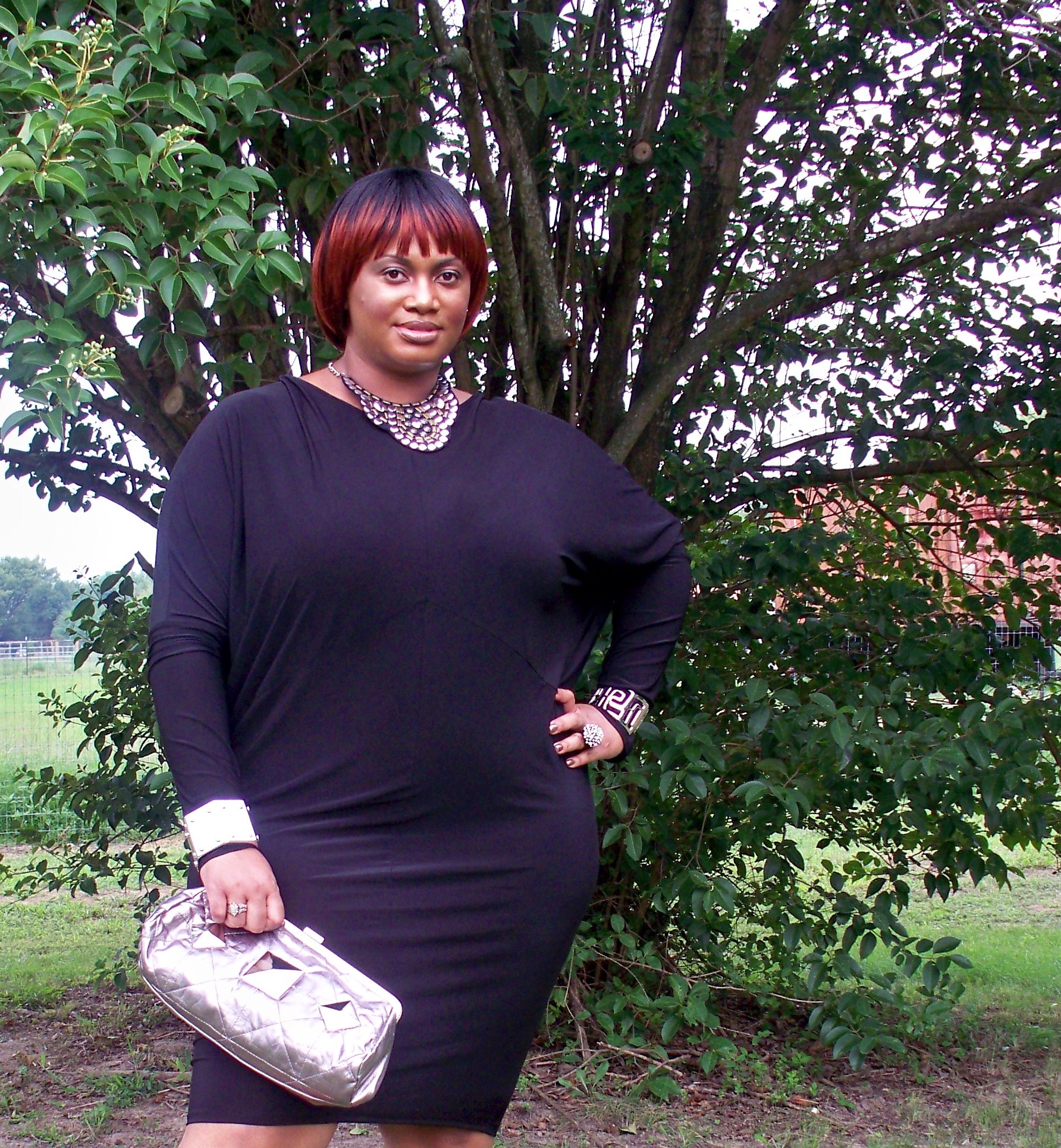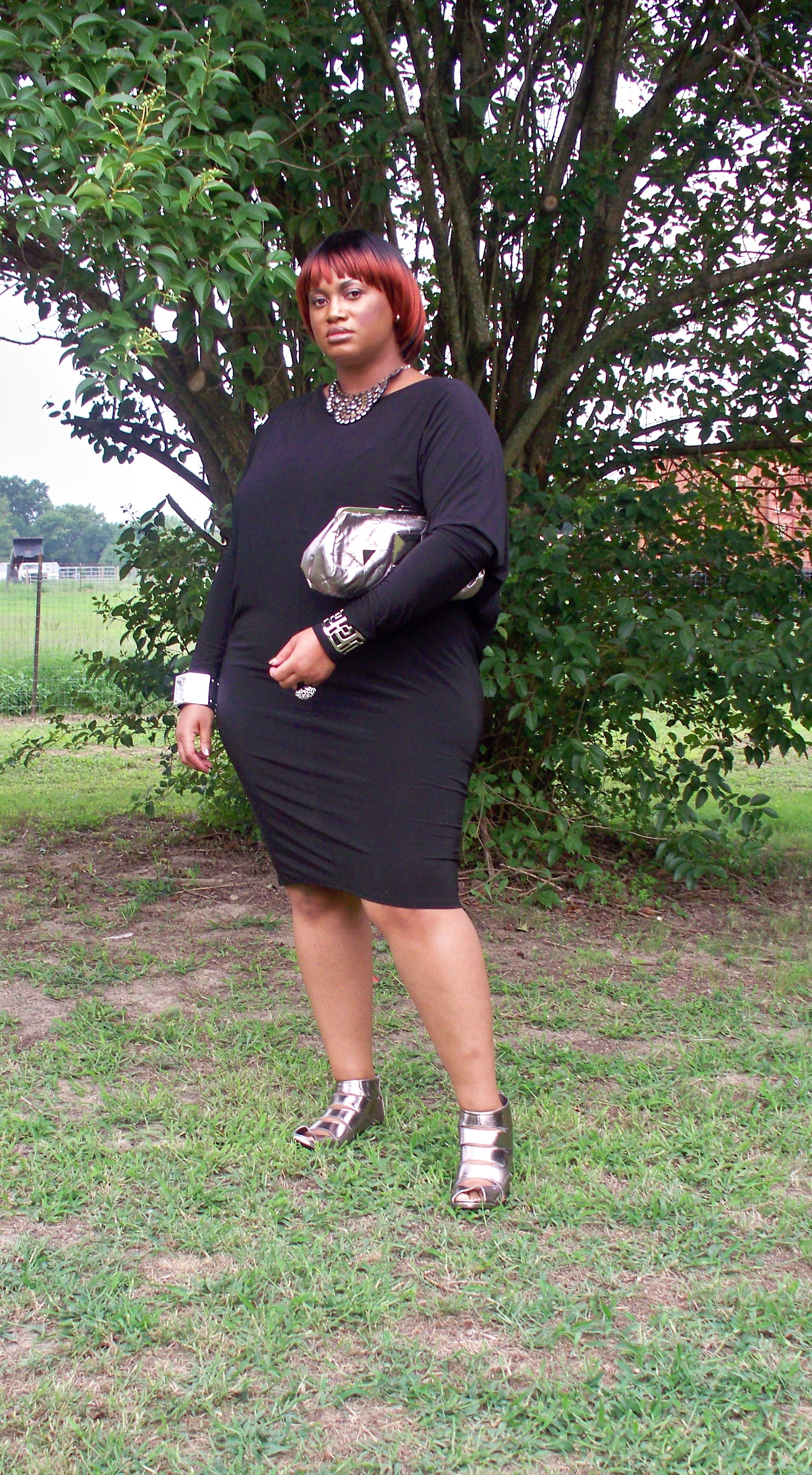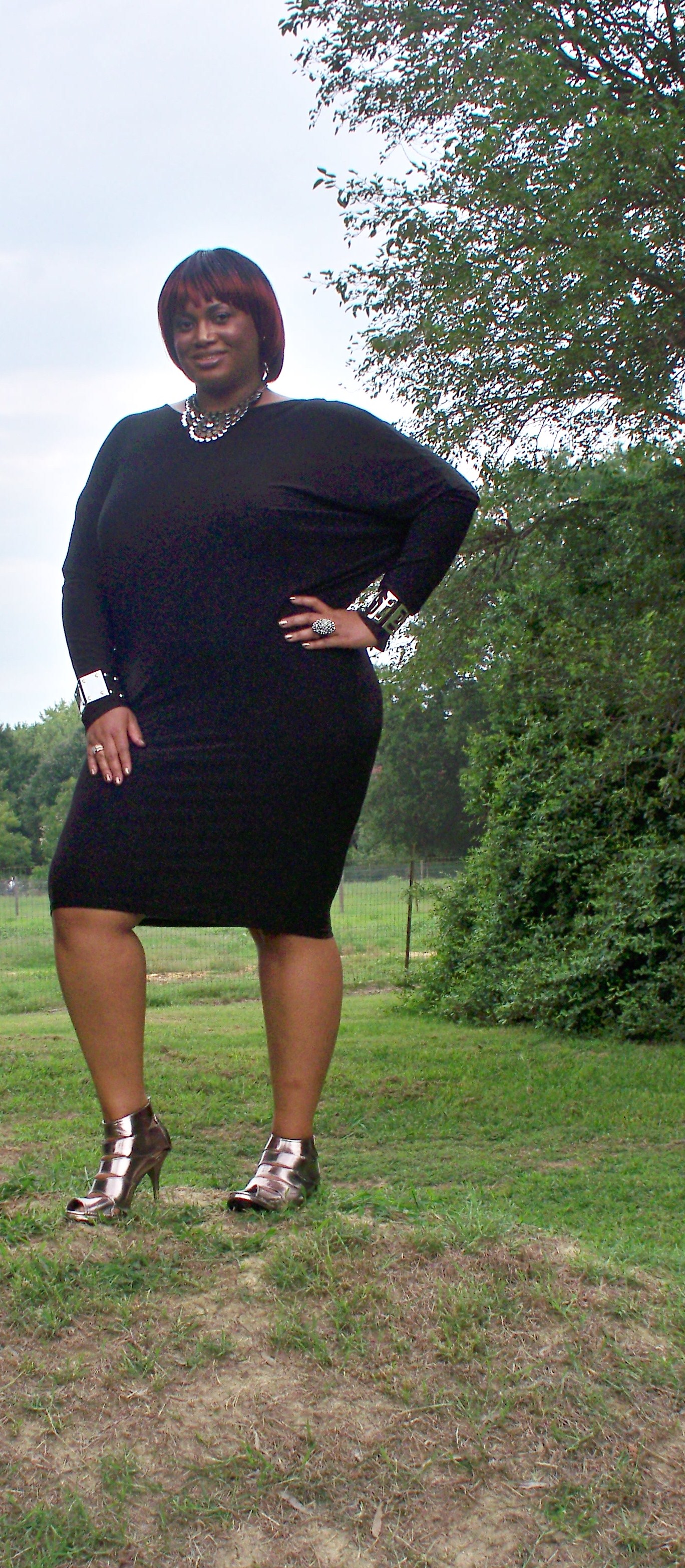 Anyway, this is the Asos Curve V-Back Jersey dress and as you already know, I’m a fan of their clothing. Anything jersey I like. What’s cool about this one is that when you raise your arms up it kinda looks like batwings but then the sleeves are gathered at the wrist which is cool for wearing your bracelets over. The back isn’t real, real low but it’s low enough as to where I couldn’t put on my body magic with it so instead I opted for the miraclesuit for foundation support. Ok, so here are the pics….(excuse my booties looking as if one was flat and the other high heeled, I was sinking in the dirt, lol)