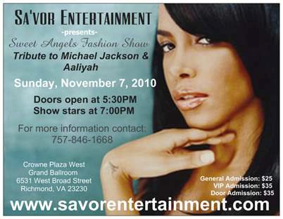 Sa’vor Entertainment presents…… Sweet Angels Fashion Show & Tribute to Michael Jackson & Aaliyah…For all the MJ and Aaliyah Fans come out and support. 10% Proceeds go to Charity of your choice. Please Visit www.SavorEnt.com for more info.