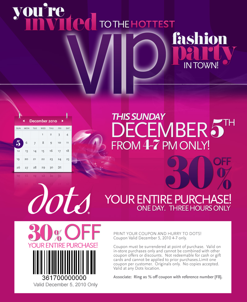 I have the inside scoop on an exclusive coupon special for tomorrow only at Dots. Use this coupon below and receive an additional 30% off of your purchase. The coupon is valid during the hours of 4pm-7pm on Sunday, December 5th ONLY. Get your holiday shop on ladies!