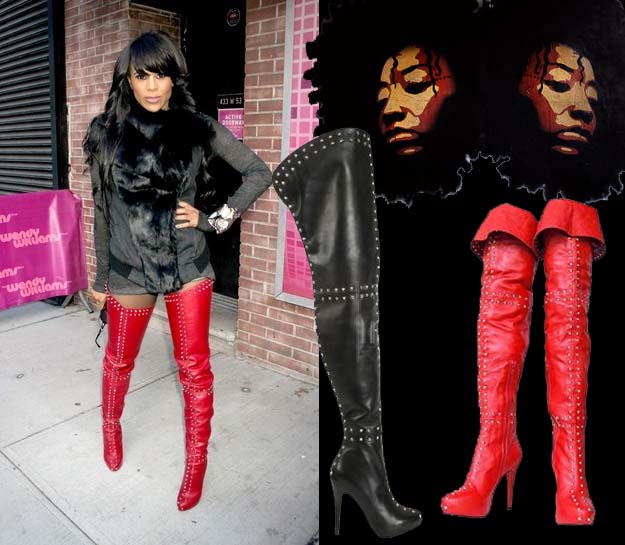 As I was watching The Wendy Williams show the other day I fell in love with guest Laurie Ann Gibson’s red thigh-high Christian Louboutin boots. They are called the “Metropolis” and they come in black or red. I haven’t located the exact price yet but I know that most Louboutin boots start no less that $1,200. Now Laurie Ann has never been what I consider a fashionista but her shoe game has been on point a few times over the years. It was her who made me fall for the neon green Uggs after seeing her wear them on “Making the Band”. So today I wanted to spotlight her hot red Louboutin’s and find a replica pair at a much more reasonable price. Now the boots I located don’t have the studs, but you can get creative and go to your local craft store and add studs to the boots with a glue gun: