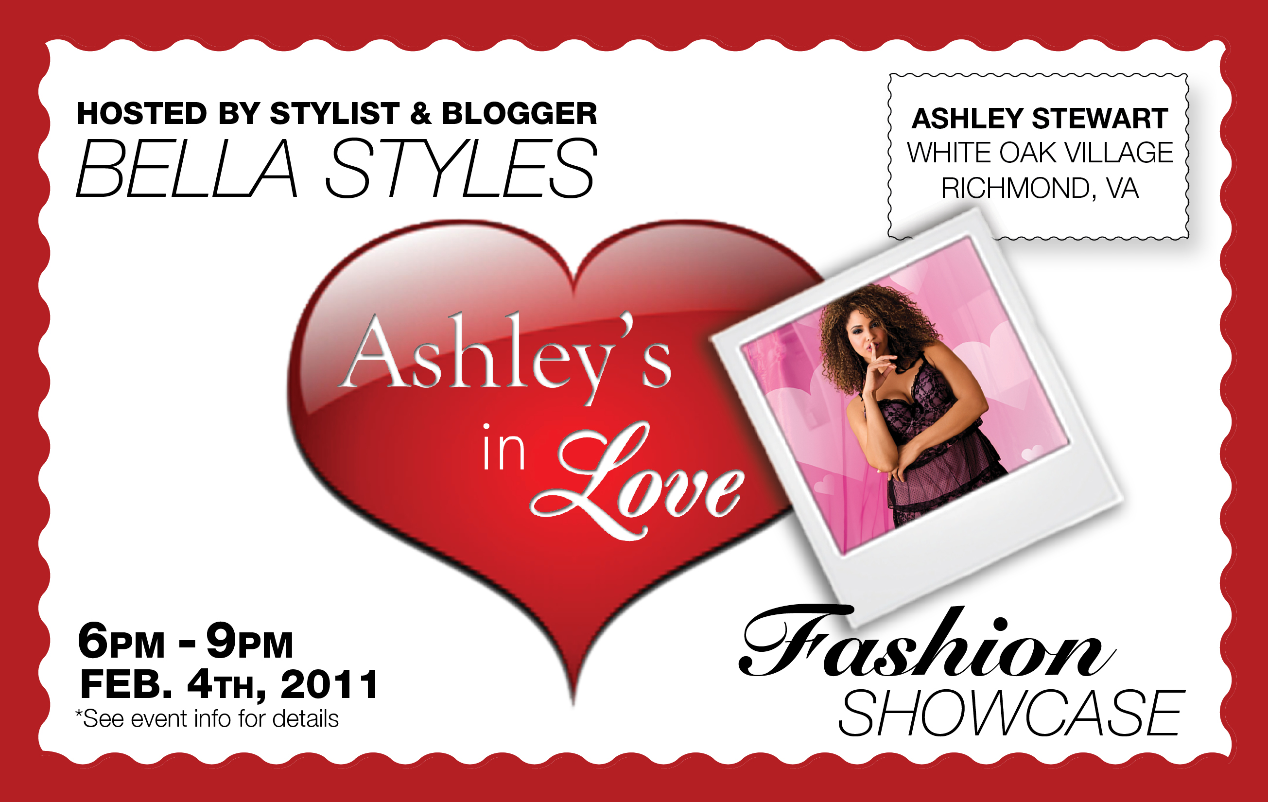 I’m so very pleased to announce that on behalf of myself and Ashley Stewart we will be presenting a Valentine’s fashion showcase entitled,  “Ashley’s in Love”. This event will be held on Friday, February 4, 2011 from 6pm-9pm at the Ashley Stewart location in Whiteoak Village Mall in Richmond, Virginia. Models that were chosen from the model call that I hosted at Ashley Stewart a couple of weeks ago will be strutting their stuff in all the new spring apparel and lingerie. I will personally be styling the models and coordinating the entire event so I’m super excited about that. Special guest and models are coming from as far as North Carolina, Maryland and DC. Door prizes and many other surprises are in store for this event. So plan to come on out and enjoy a “Girls Night Out” type of atmosphere and get all of your Valentine’s goodies and spring wardrobe while there!!!
