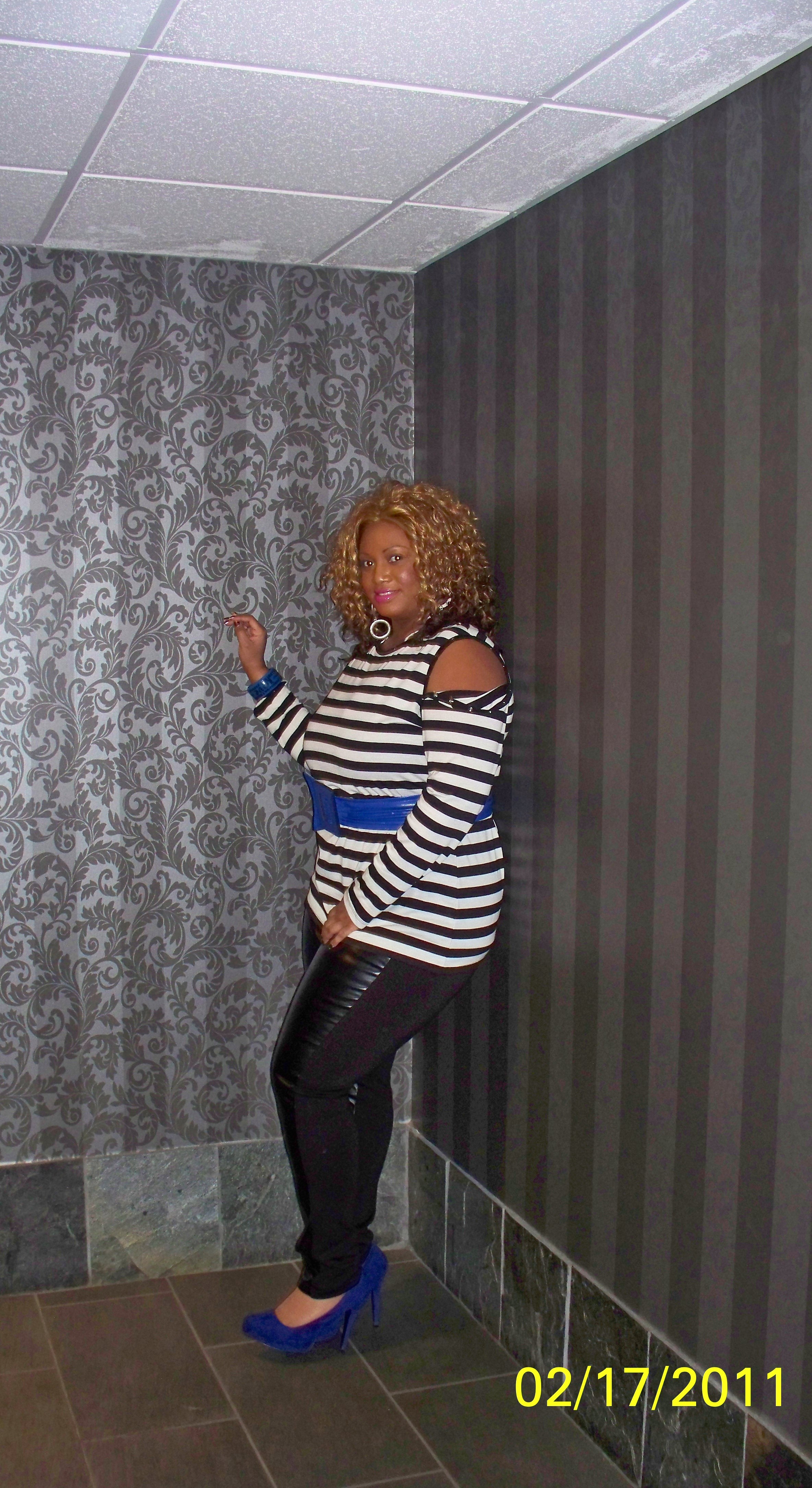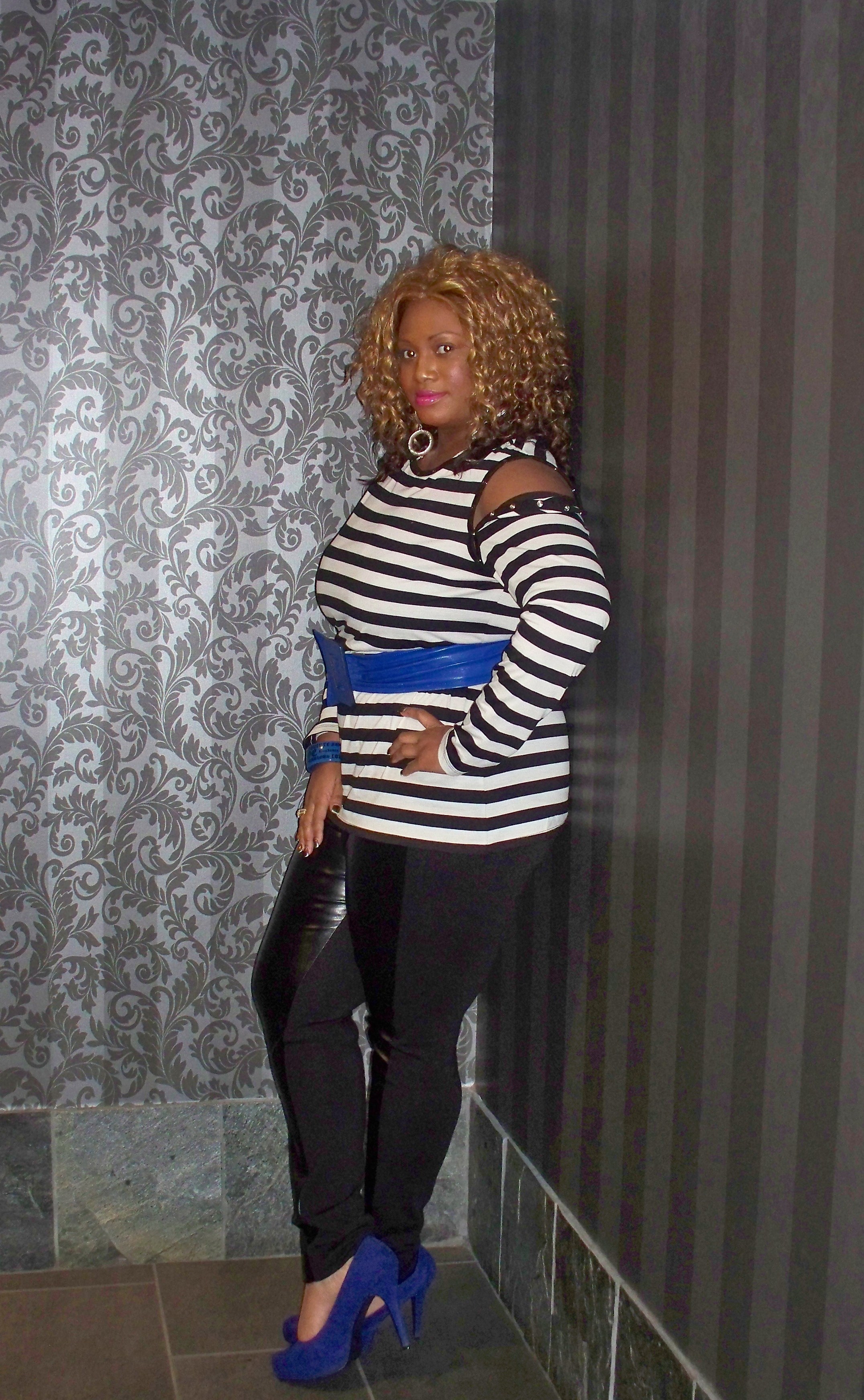 Today I finally got a chance to wear my Miss Tina striped tunic that I purchased last month. It’s from her new spring collection at Wal-Mart. I seriously have been stalking her page daily waiting for all of the collection to drop but it hasn’t just yet. I did a post last month about curvy women wearing stripes and since it’s also a spring trend I couldn’t wait to put this on. (Plus with the weather being in the 70’s today what better time). This tunic can be worn with the snaps on the shoulder open for the “cold-shoulder” look, it can be worn long sleeved or you can un-snap all of the buttons for a sleeveless look. I didn’t want to keep this look just plain black & white so I threw in a splash of blue. The tunic comes with a black belt but I added my blue one instead.
