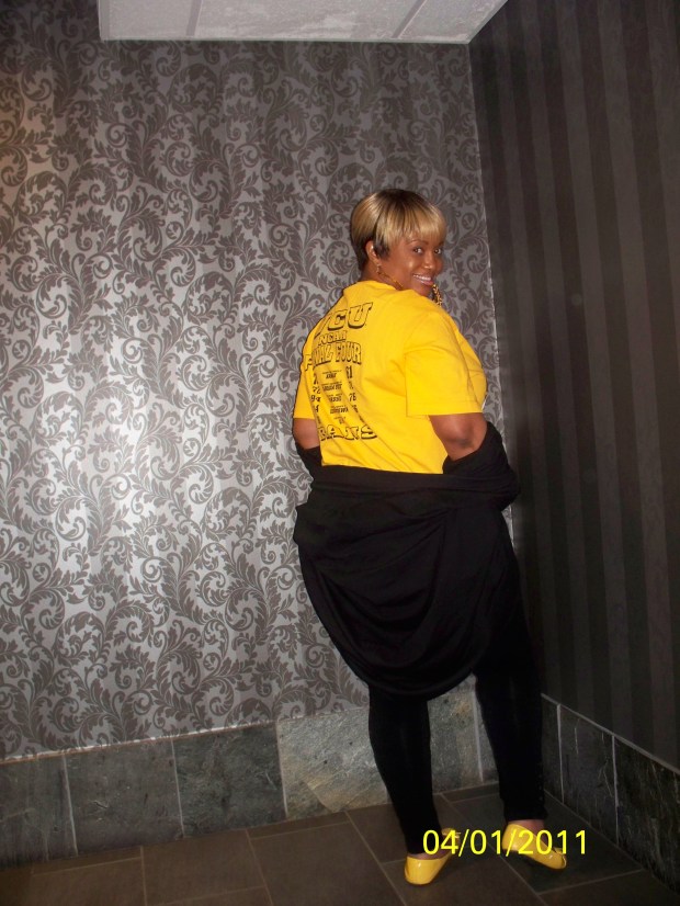 So in honor of the Rams I wore a “Final Four” shirt in the signature black & gold (yellow) color. I’m not a t-shirt kinda chic so I had to try to pull this one off the best I could. My mom happened to be in JCPenney at the right time Wednesday as they were just putting these shirts on the floor. She said literally in a matter of minutes they were all gone. Luckily she called me, as she usually does when she sees a killer sale, and asked was I interested in one. Once again I said yes and she also grabbed my son one too. Good thing too, I got stopped so many times today with people complimenting me and asking where’d I get the tee from. (Gotta love it, Mom dukes is “MY” personal shopper and I’m the personal shopper for all of my clients, lol).