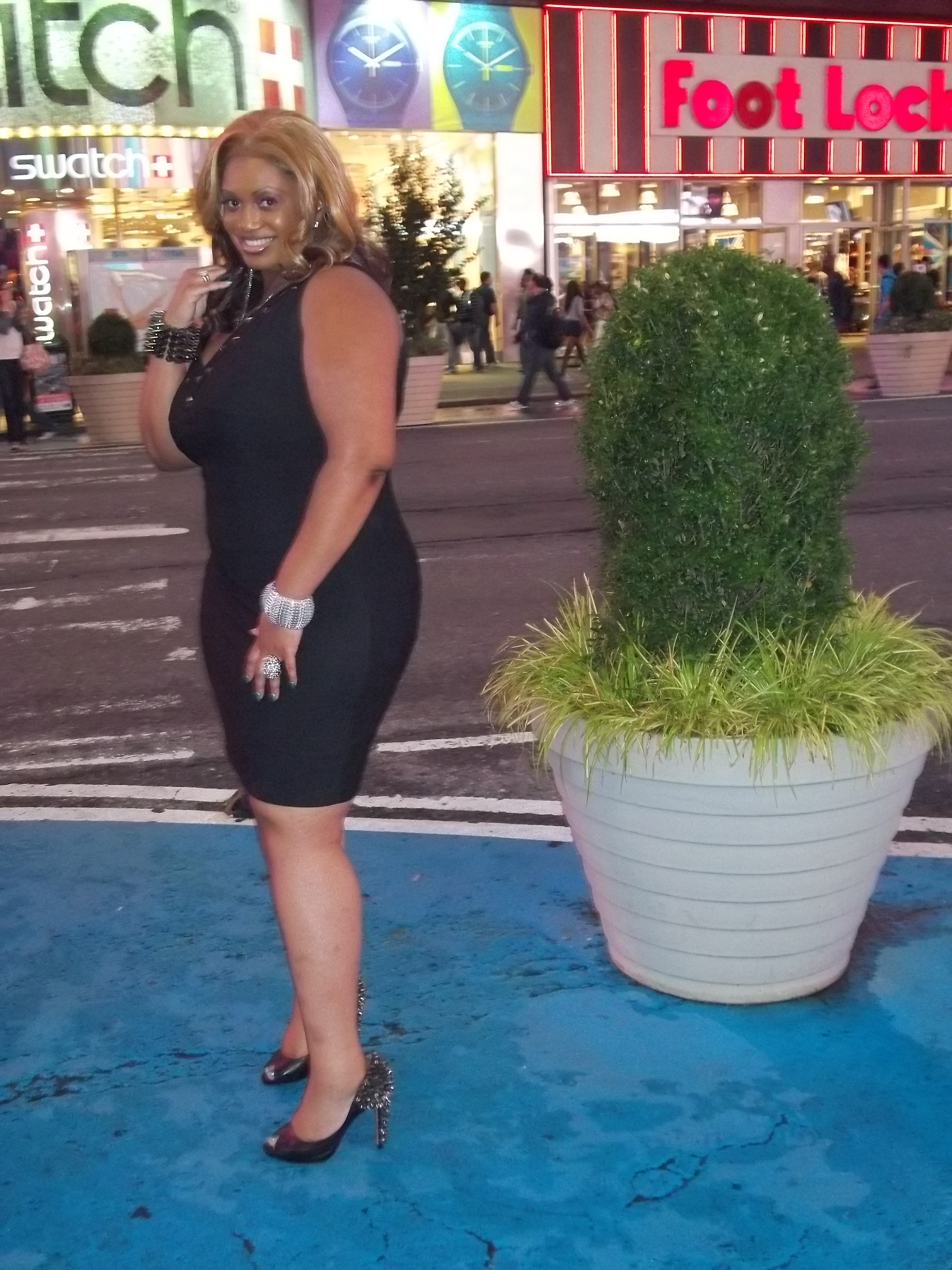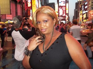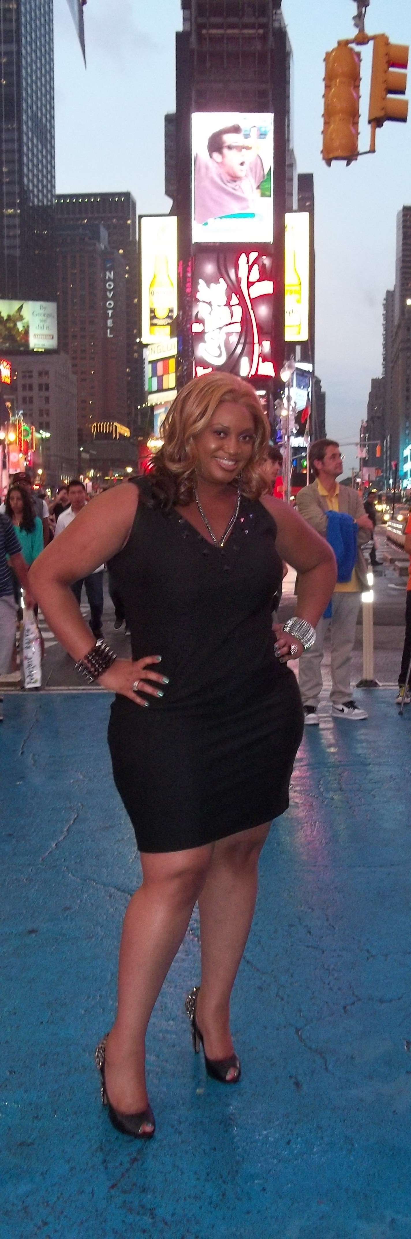 The dress is a “Herve Leger” inspired piece from Ashley Stewart. The Herve brand will run you over $1,000 and this one from Ashley Stewart is only $50. I usually don’t go this clingy but I said what the hell, I’m in NYC, go all out. To complete the look I added the “it” shoe of the moment, the Sam Edelman “Lorissa” studded pump ($200 from Nordstrom). I already had these in suede once before and these are the leather version. No joke but they sell out so quickly that you have to buy them right when you see them available in your size. Rounding the look out is the spiked bracelet that I just got yesterday from my fave jewelry store in NYC. So after the event I went to Times Square to get my photo op on. Afterall, where else to flaunt but in the “City of Lights”, NYC that is!!!