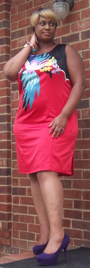 Today I wore this new dress that I purchased from off of the HSN website. I have had my eye on it for months and it went on sale recently. It’s called the “Bird of Paradise” dress by Very Vallbracht. I ordered it because of the vibrant hue of red with the bird print. The bird print is on the front and the backside of the dress. I ordered the size 2X and it hits right above my knees. The dress is made of a silky stretch red charmeuse with a side zip and side vent. I paired the dress with my Charlotte Russe 5 inch pumps. (Yes, I said 5 inches but they are really comfortable because of the platform). I wore the black pair at first, then changed into my purple pair later on in the day. I haven’t really worn heels in weeks but these were just fine. They look more intimidating than they really are. Since I was in church, to make the ensemble more appropriate, I added my black Torrid jacket to dress it up. This jacket has become my everyday jacket as it is so versatile to dress both up or down.