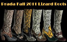 I know, I know, it’s 99 degrees outside and you’re probably not thinking about Fall fashion just yet. But me being a fashionista, I always have to stay a season ahead. With that being said, I’m reading the new Fall 2011 fashion mags and there are some hot new styles in the works for us. I’m noticing a lot of designers are using the white poets shirt in their ads. As well as various style clutch bags being a top trend. Chanel has a new Fall nail color called “Peridot” that’s a unique shade of shimmery green. Color-blocking and bright hues are not going away anytime soon either…not even for Fall. Even menswear is sticking around for another spell. Designers such as YSL and Stella McCartney are putting sexy-feminine twist on the menswear trend by adding sheer polka-dots and high-waisted pants. But what I’m guessing to be the number one must-have item for Fall 2011 is this Prada lizard boot that I have at the top of the trend list: