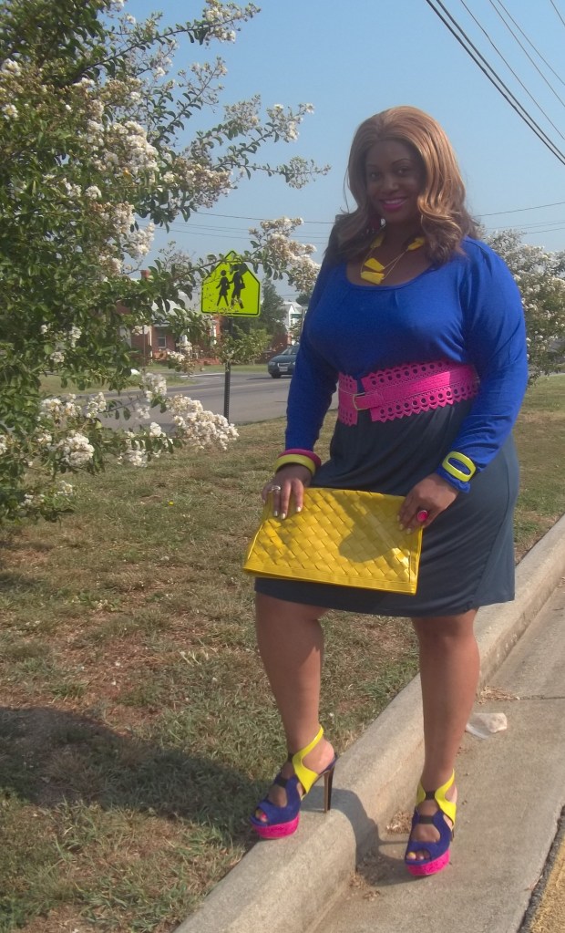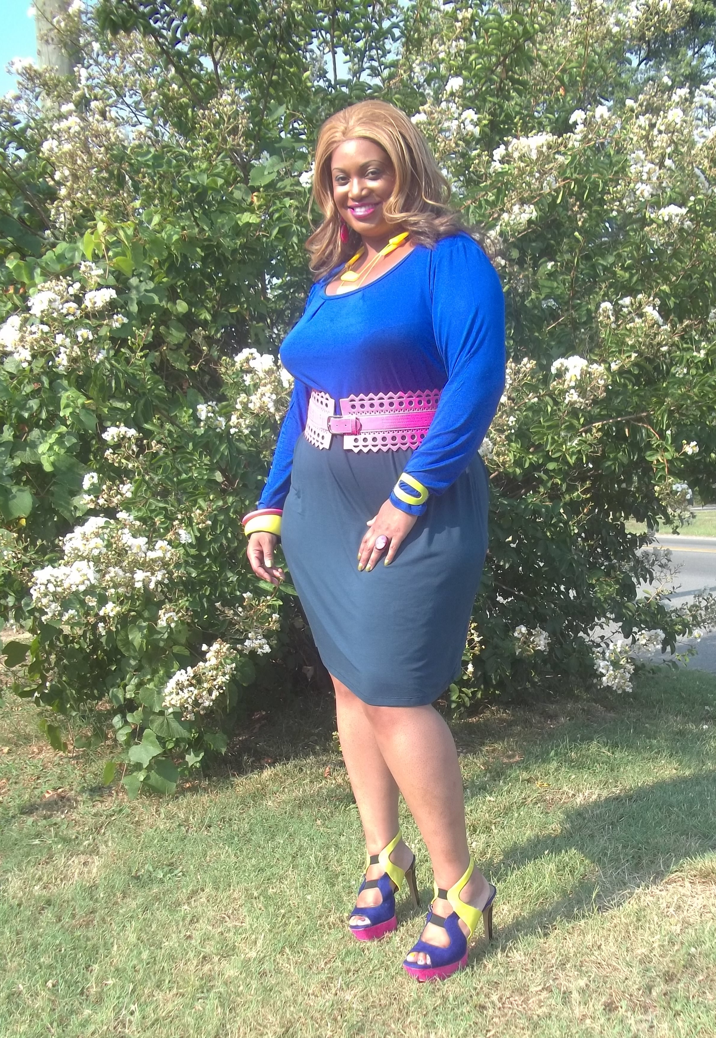 My dress takes on the color blocking theme too as it is deep purplish-blue at the top and like a slate grey on the bottom. At first I didn’t think that I would be able to pull off this dress and the shoes together but for one, I couldn’t wait another day to wear these shoes, and two, I figured once I added my jewelry it would all blend together. Not bad if I must say so myself. In the pics it’s not that noticeable that the top of the dress and shoes are not exactly the same shade of purple. The reviews of this dress on the HSN website are horrible but I don’t have any complaints. It’s a thin jersey material so it kept me cool on this 100 degree day. That’s why I seldom go by reviews. Some customers are just so hard to please and picky. Plus after snagging it for the sale price of only seven bucks I can’t complain!