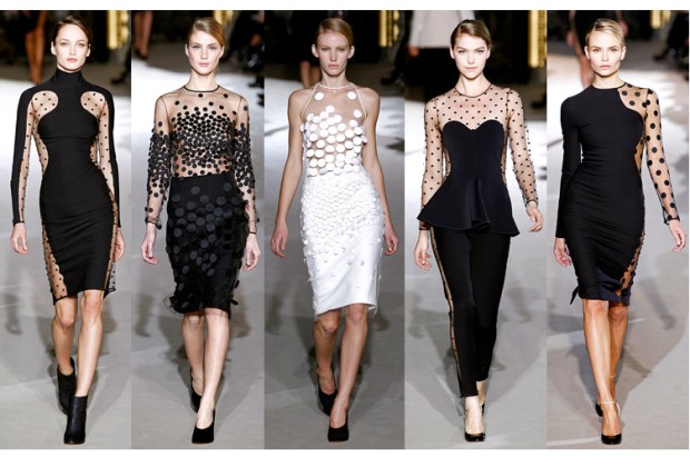 I have been obsessing over this Stella McCartney “Lucia” sheer sleeved polka-dot dress ($2,155) ever since I first blogged on it as a must have for Fall 2011. Many celebs have already been seen wearing it on red carpet events. It comes in different styles too. Over the past few weeks I’ve been seeing quite a few similar patterned dresses on various websites. So if you like this style too take a look at a few more of the inexpensive choices: