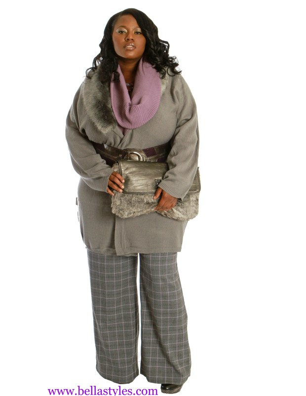 Next was what I call her “boardroom ready” look. When I first laid eyes on this faux fur collar cardigan I said this is for the “boss business woman”. Well that’s Tionna. She can wear this outfit to a meeting with a client and make power moves. I switched it up a bit though from my original styling for the AS website. This lavender ribbed turtleneck went so well with Tionna’s makeup that I used that instead of the aqua. The high-waisted plaid trousers have a lavender print in them too and once I added the purple belt, that made the outfit complete. As a stylist I often find myself purchasing items on a whim not even knowing where I’m gonna wear them. That was the case with this grey faux fur clutch. I’ve had it in it’s shipping package since last year and haven’t had a use for it until now. The clutch went perfect with Tionna’s collar of the cardigan.