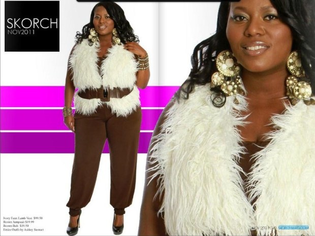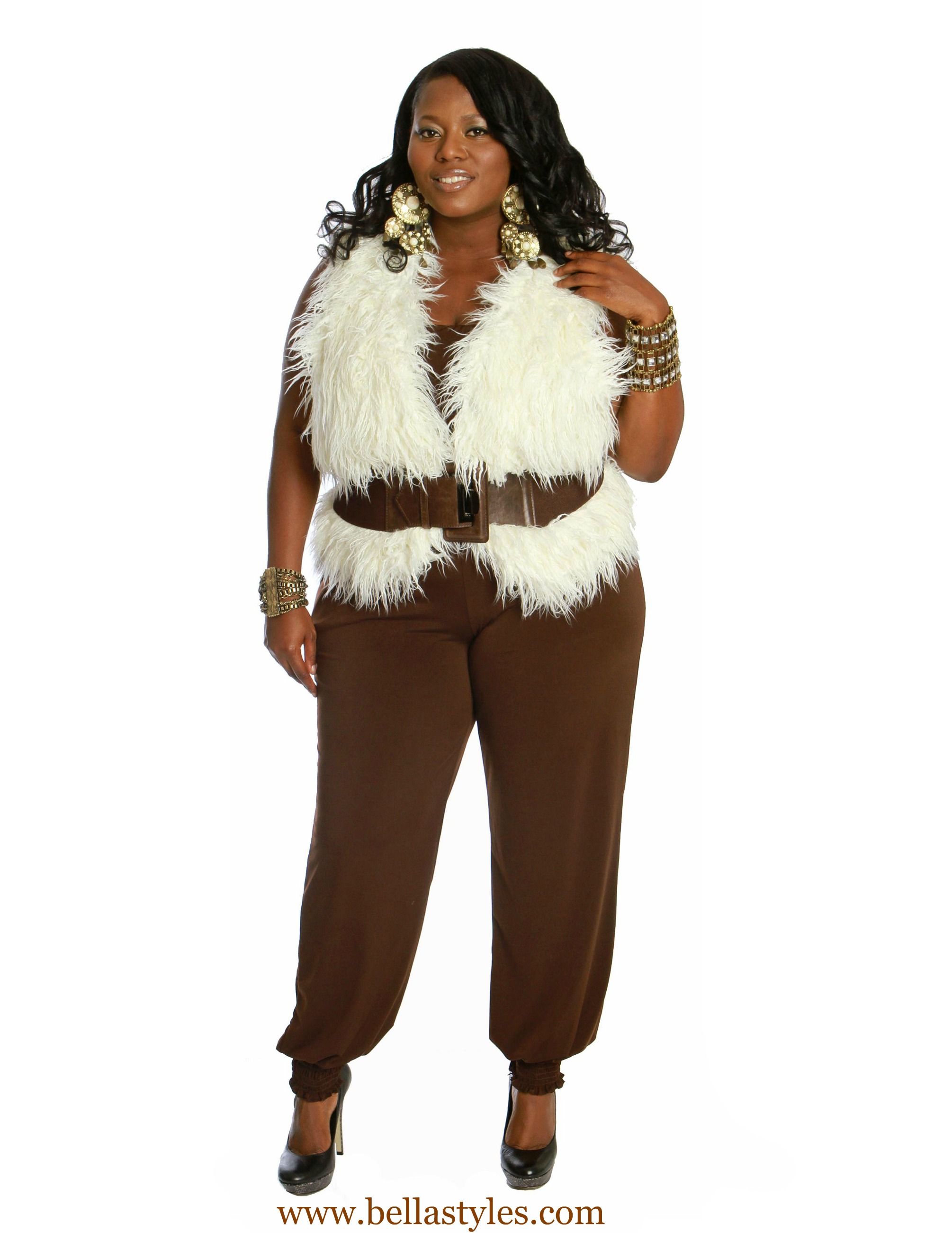 For the last Ashley Stewart look I went “all out” edgy. While shopping in the store last week I saw this faux lamb vest and started thinking, “that would be great for a photoshoot”. Tionna calling me was perfect timing because I was able to style her in this and it looked fab on. I used the same jumpsuit as I did above but instead this one is plain brown instead of leopard print. I added a brown belt to accent her waistline and the bold gold/ivory earrings and bracelets were all Tionna needed to complete her edgy look. I think this was my favorite outfit of the entire shoot.