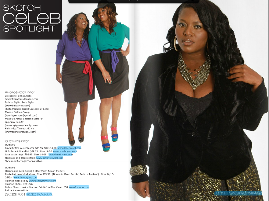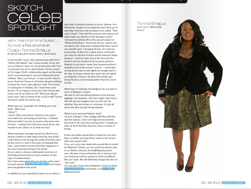 In last month’s Skorch Magazine I did a photoshoot with VH1’s “What Chilli Wants” star, Tionna Smalls. So for the December issue of Skorch I have my actual interview with Tionna and part two of our photoshoot. Tionna served as TLC singer Chilli’s relationship expert on the show and is now releasing her second relationship book entitled, “Men Love Abuse”. In last month’s Skorch issue I featured Tionna in all Ashley Stewart clothing to show her more urban glamour side. This month I’m styling her in Holiday 2011 looks from Lane Bryant. I’m so happy to announce that Tionna also chose one of my looks for the “Men Love Abuse” book cover.