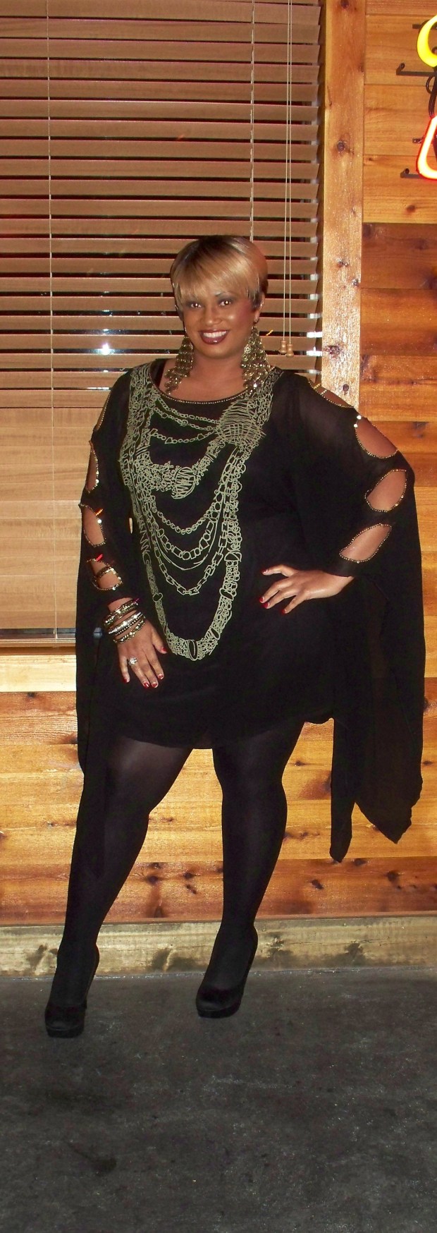 Last night I finally got to play dress up for the first time this year for my BFF’s birthday party dinner. I wore this dress that I have been saving for over three months now by Zandra Rhodes for Simply Be. This was supposed to have been my New Years Eve dress but since I opted for staying in this year I didn’t get a chance to wear it then. I first fell in love with this piece when the collection debuted late last year. I had my friends over at Simply Be to send it to me so that I could review it for my readers. What attracted me to this dress were the Elvira like sleeves or wings as I like to call them. I knew this outfit would be a head turner. A waitress in the restaurant even stopped by our table during dinner and said she couldn’t help but tell me how she liked how my dress sparkled every time she walked past the table. This dress is made of viscose material and is only 35-inches long and since I’m not used to wearing really short skirts or dresses I opted to wear Torrid’s black opaque tights with it and my Charlotte Russe black pumps to camouflage the length . (A little trick I learned from watching Wendy Williams do this technique quite often.) Since it was really cold out last night it was either gonna be pumps or booties regardless, but for the summer time I have these Viva La Diva Sandals in black/gold to pair with it. Being that the dress already has a necklace print made into it I kept my jewelry minimal by adding only some bangle bracelets ($19.50) and chandelier earrings ($14.50) from Ashley Stewart to complete the ensemble. I absolutely loved how the final look came out and can’t wait to wear this baby again!