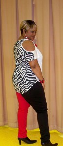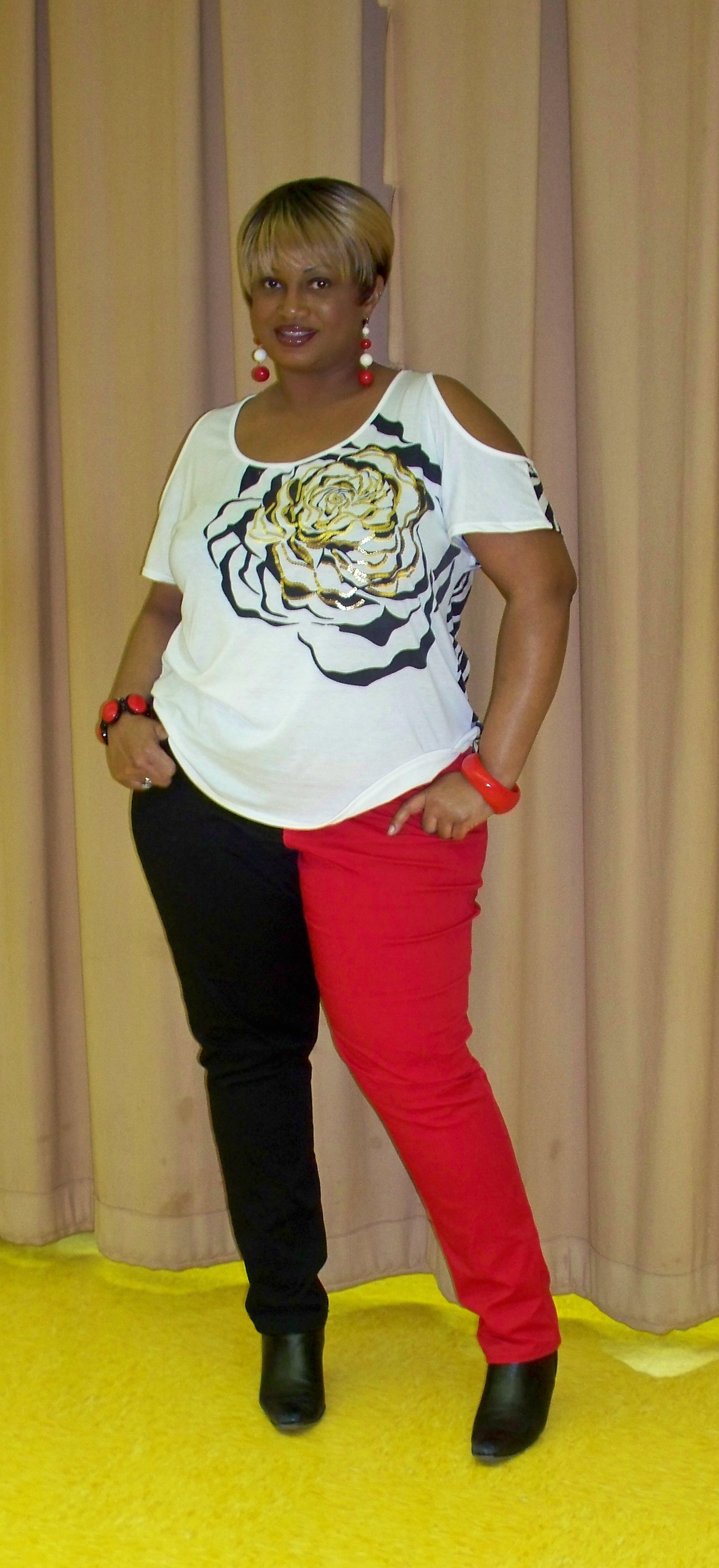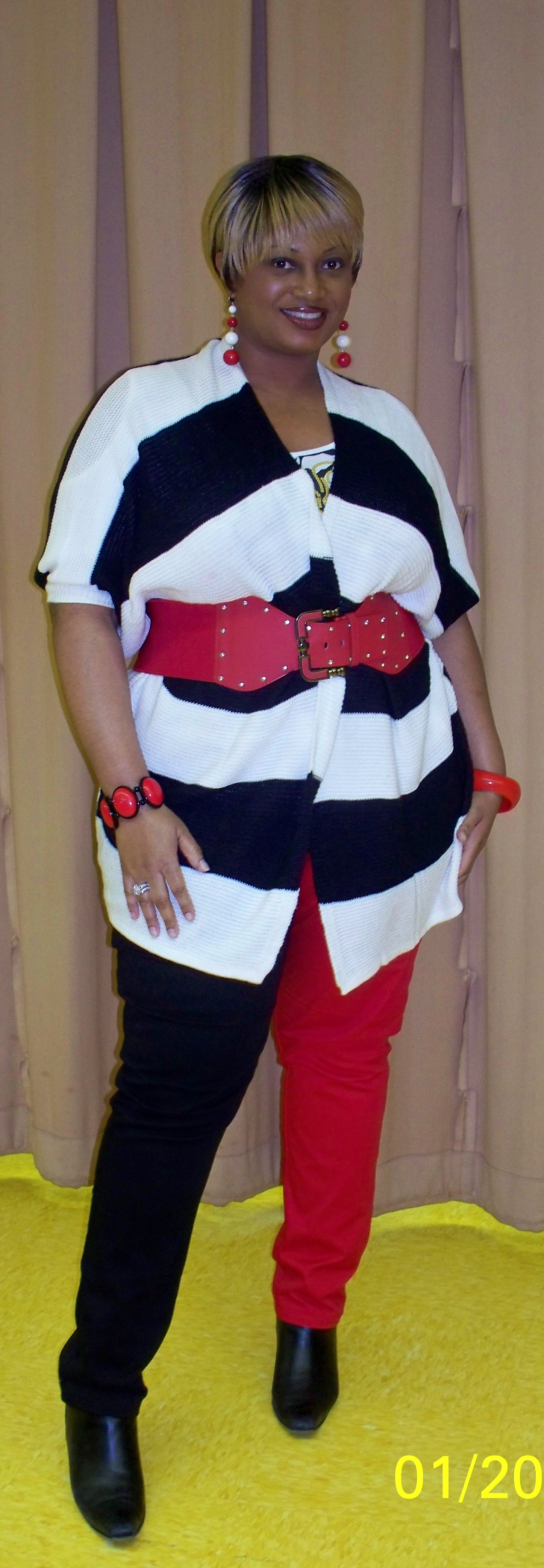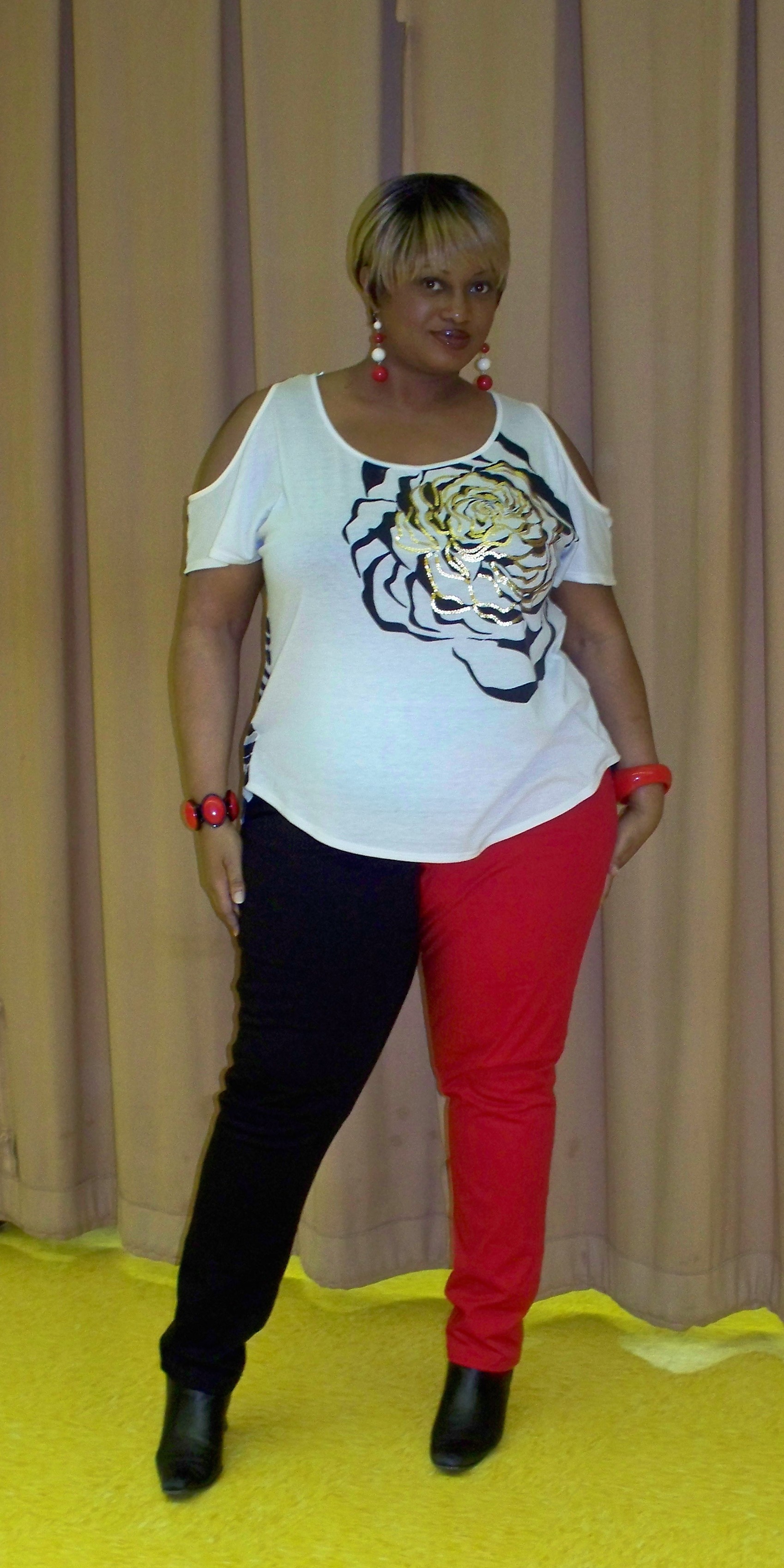 Before I start off let me just say that everyone’s individual style is different and mine is often times very edgy, so please save the hate mail for someone else, lol. Now with that said, today’s post is nothing but “on the edge” fashion. My sons school does quirky little things for the kids from time to time so today was “Mix-Match Day”. Since I was having lunch with him, I decided to participate as well. Plus it gave me a chance to wear these red and black split jeans that Torrid sent me some months ago. These are another form of the color blocking trend but I didn’t want to add another ‘bold’ color to the red and black so I just kept it simple by adding white. (Well I guess the zebra print was bold enough anyway). I paired the jeans with the Ivory and Black Stripe Cardigan , which unfortunately I see has sold out. Now while I have already been wearing this cardigan almost daily because it is so comfortable and versatile, today I wore it with this red belt and put the zebra cold-shoulder tee underneath. On the front of the shirt is a huge flower but when you turn around it’s all zebra print. Pretty cool two for one, and I was definitely on point for mix-match day.