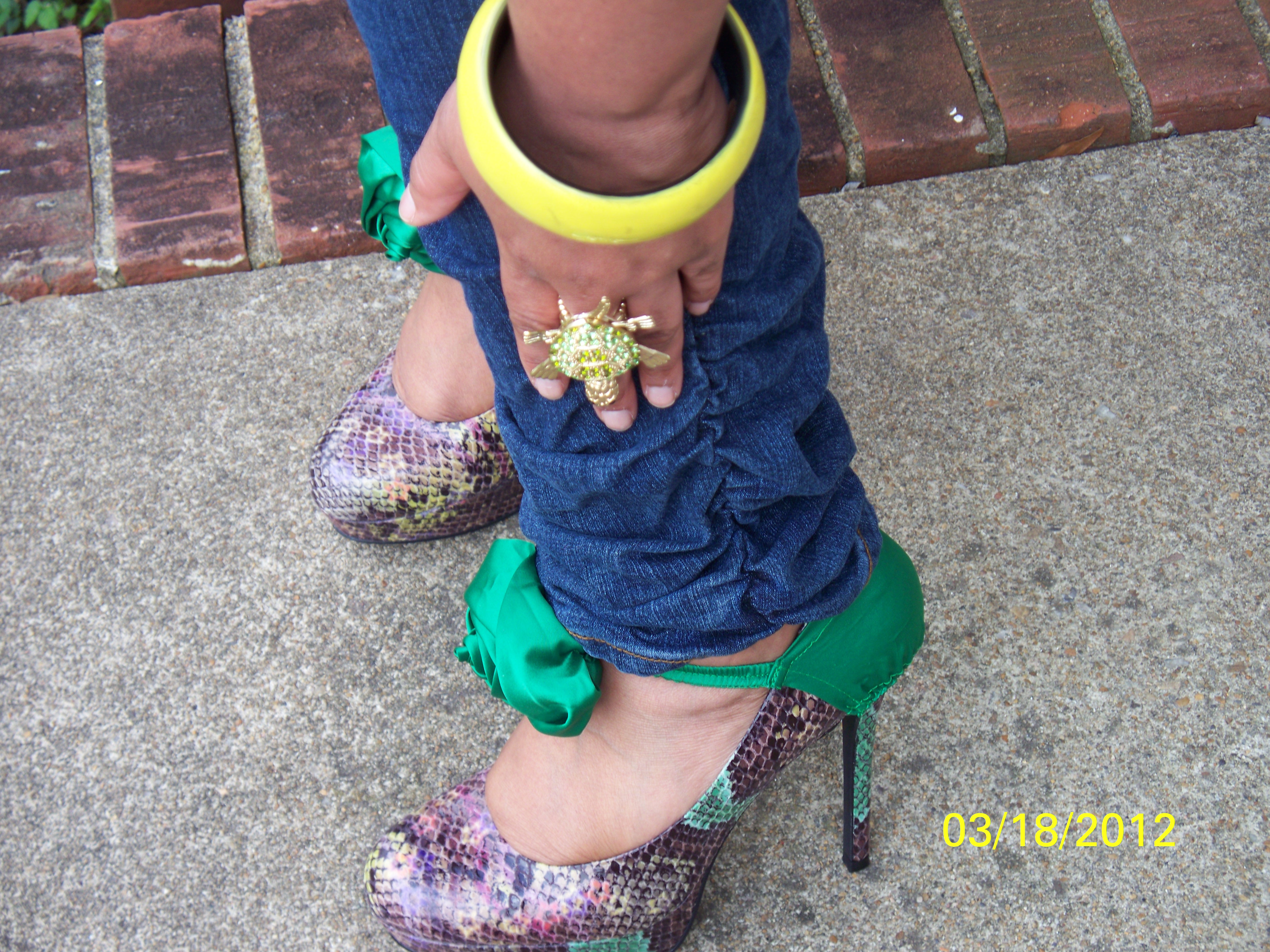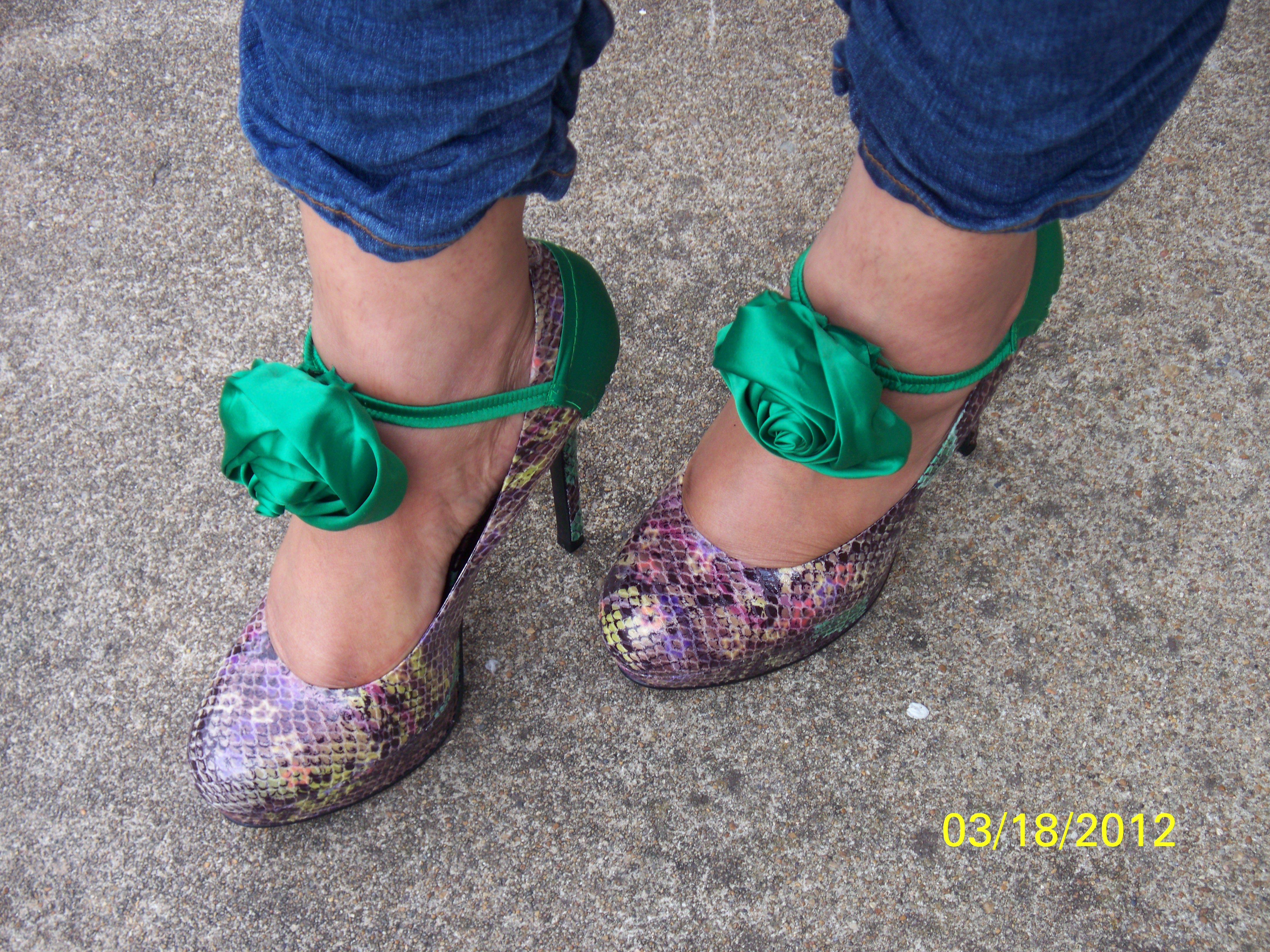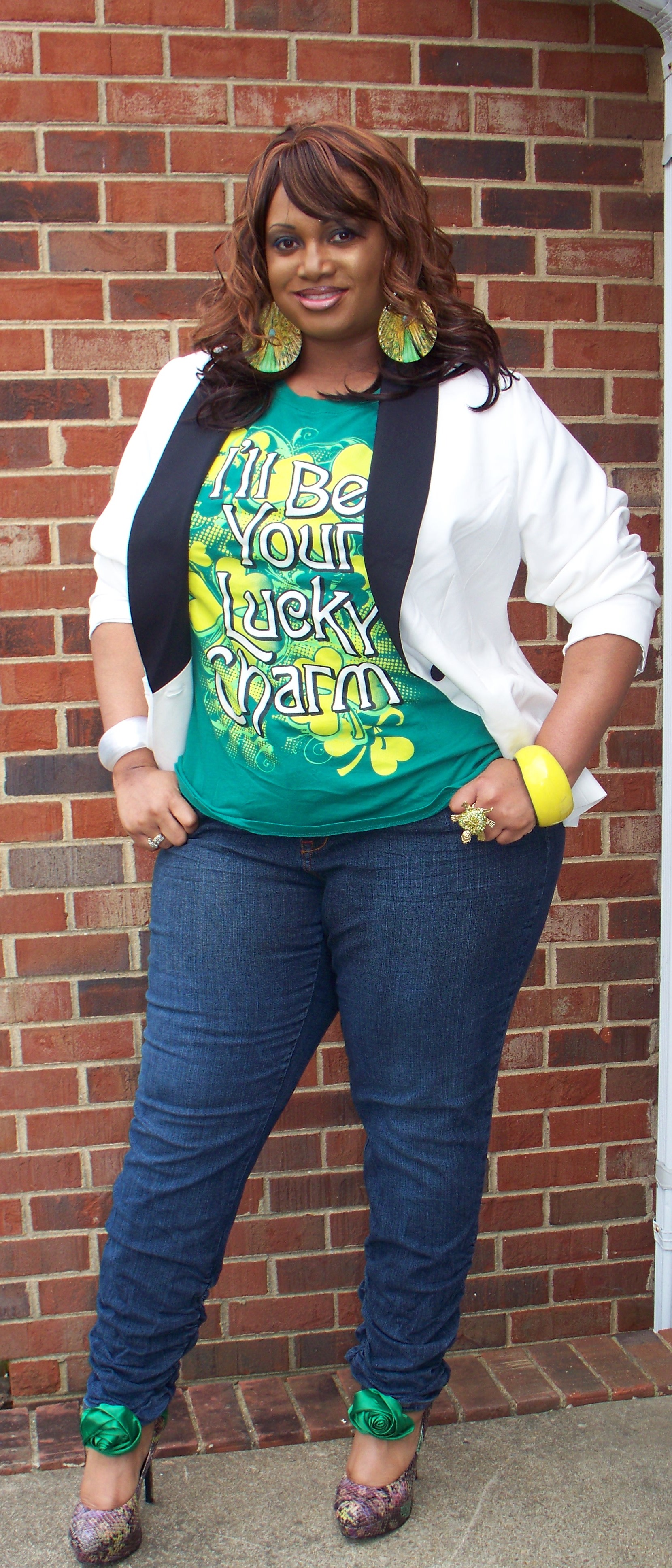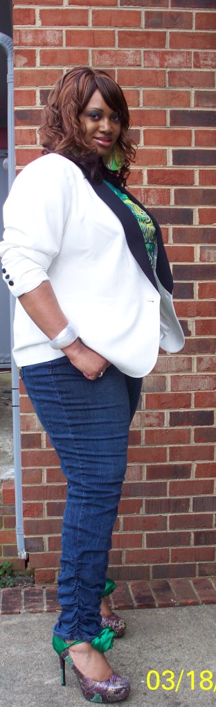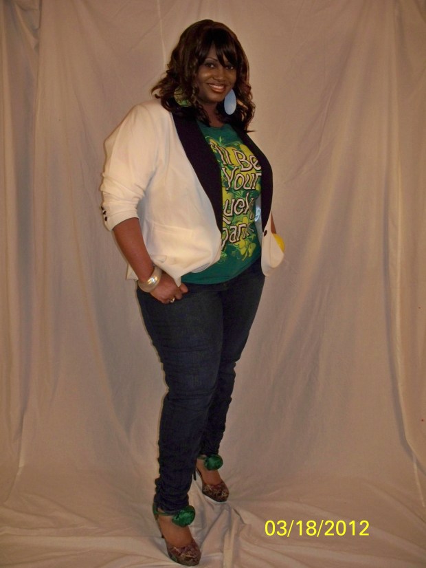 Today’s OOTD (Outfit of the Day) is a combination of St. Patrick’s Day, the trend of blazers and a neat little shoe accessory that I just love. I was lucky enough to be chosen as one of the panel judges for the Majesty’s Closet Model Call that was held today so I wanted to be fashionably ready. Earlier this week I blogged on the topic of blazers being a must have trend for the spring and today was the perfect weather for wearing one too. Mine is from Simply Be and is one of the most popular of the season. I have heard a lot of ladies calling this their fave. It’s called the “Bespoke Editors Pick Tuxedo Jacket“ and is very versatile. I dressed mine down with a St. Patrick’s Day baby-tee from DEB. Even though St. Patrick’s Day was officially yesterday, I was still in the mood, lol. I wore them with my ruched-skinny leg blue jeans by Rocawear and jewelry from Ashley Stewart. Now as for the shoes I was so excited to finally be able to wear my “Heel Condoms“ shoe accessory. They were sent to me to review a few months ago so today I paired them with my snakeprint pumps from Bakers Shoes. I got these pumps back in October during one of Bakers 1-day sales for only $39.99. Heel Condoms are shoe accessories that easily go over the heel of your pumps and can completely change the look of your original shoe. They come in different styles and colors and you can instantly transform the look of a plain pair of shoes and make them extraordinary within two minutes. In the end I guess I was a “Lucky Charm” for a lot of the models, my judging input helped send a majority of them on to the next level. Congrats ladies!!!