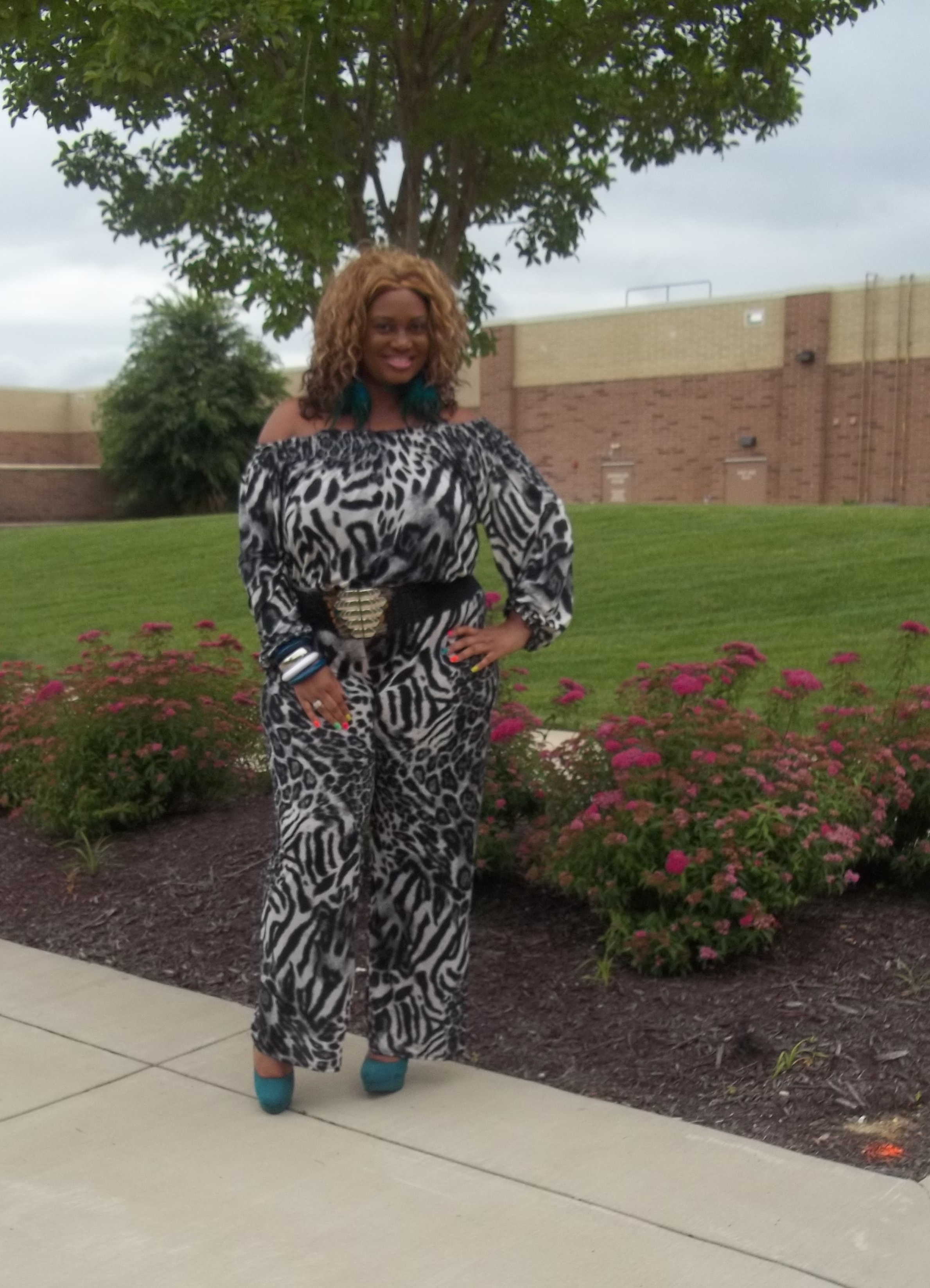 I have been holding this outfit in my closet since last summer. It’s the animal print jumpsuit from Ashley Stewart. I got it when it went on clearance for about half price, $20. When this jumpsuit first appeared on their website a couple ladies left comments that it wasn’t cute or that it wasn’t their taste. But I knew that I could do something to bring it out. I like to take chances with fashion. You can’t always go by the pic on the model on a shopping website. You have to visualize what accessories would make the outfit pop. In my mind I thought of a pop of teal color. It can be worn both on the shoulders and off. So I took a walk on the wild-side and here’s how it turned out: