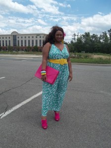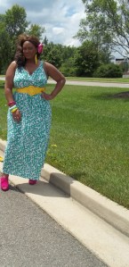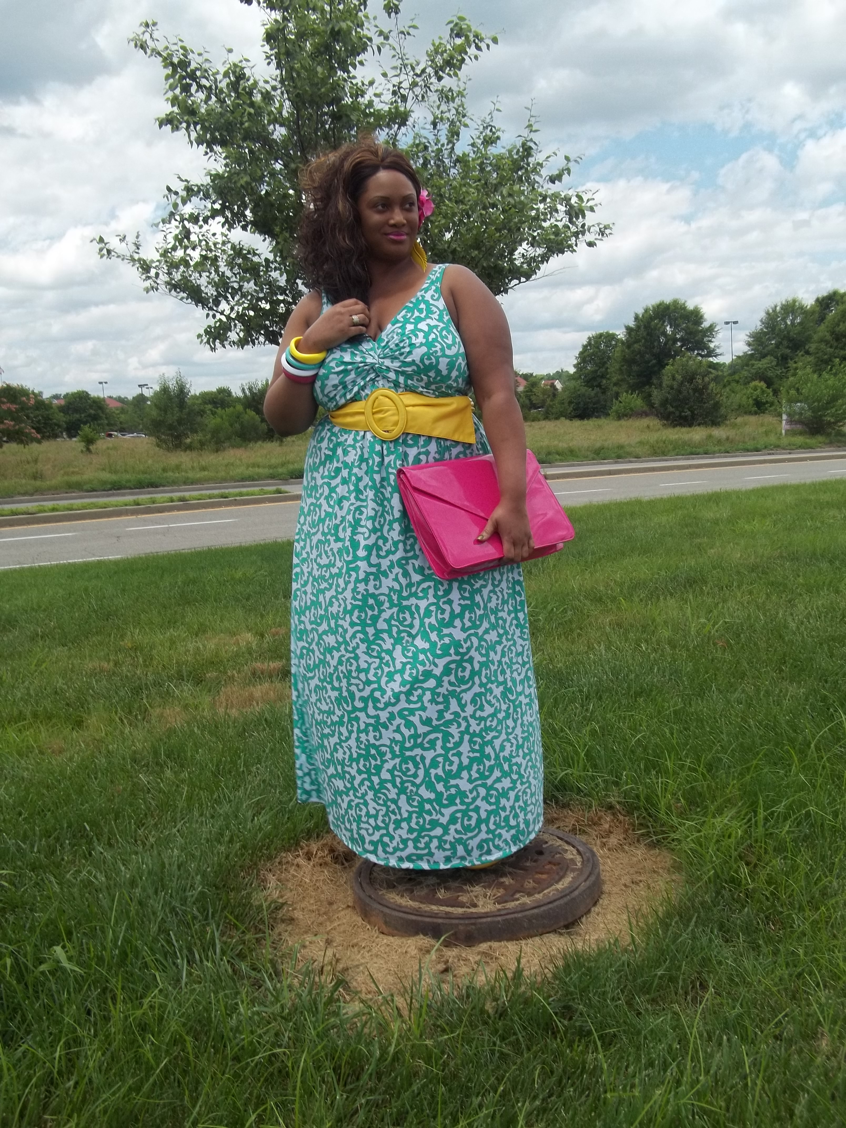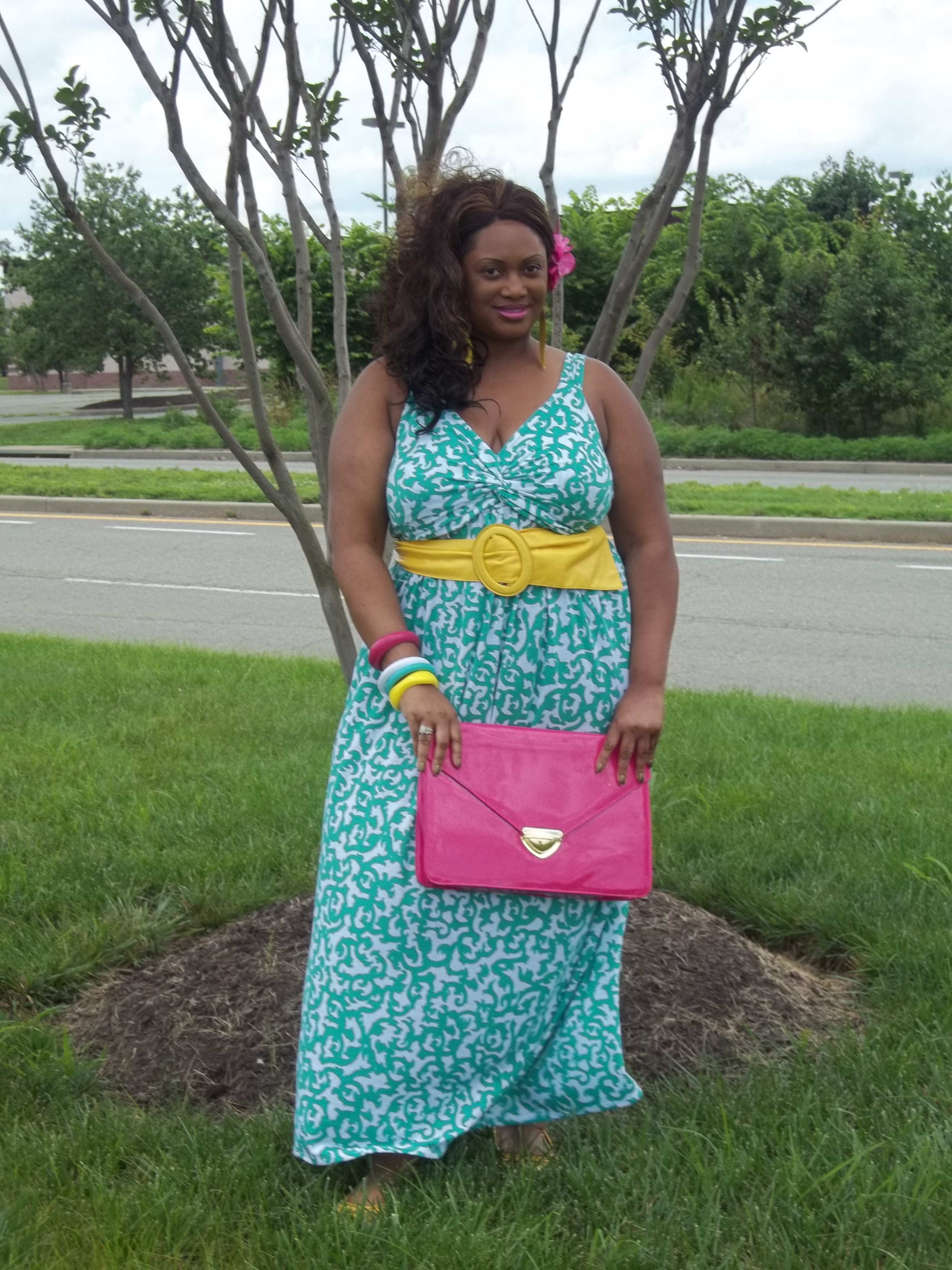 I’ve been secretly stalking the Wal-Mart website every week since around March scoping out the new spring/summer Miss Tina collection. I have so many of her items from previous collections and I am a loyal fan. Not only are you getting quality fabric in your items but nothing’s over $20 either. Well I had placed a few items in my wish list/shopping cart a while ago and then last week when I finally decided to purchase them my size was sold out. I was heartbroken. But about a few days ago a light-bulb went off in my head and said to go back to the Wal-Mart website and do a store check on the items that I missed out on. I’m so glad I did that too, it showed that my local store had the dress that I wanted but there was ‘low stock’. So early Thursday morning I ran to Wal-Mart and low and behold, my size and the style dress I wanted was in the store. I was like a kid in a candy shop. (Shopping Hint: When shopping for Miss Tina products in Wal-Mart, just look for the black hangers with her name stamped on them. That differentiates her clothing from the others that are on the regular white hangers). I purchased the twist front maxi dress in agean scroll jade. This dress is just like the splash print version I wore last May. I believe I have about 10 of these dresses in total in all different prints. That’s how much I love this style. It’s perfect for a casual day or you can dress it up a little such as I did below: