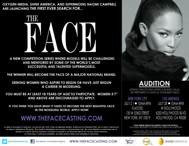 OXYGEN MEDIA and supermodel NAOMI CAMPBELL are launching the first ever search for a new competition series where models will get the opportunity to compete to become, “THE FACE” of a major national brand. NO SIZE REQUIREMENTS!!!