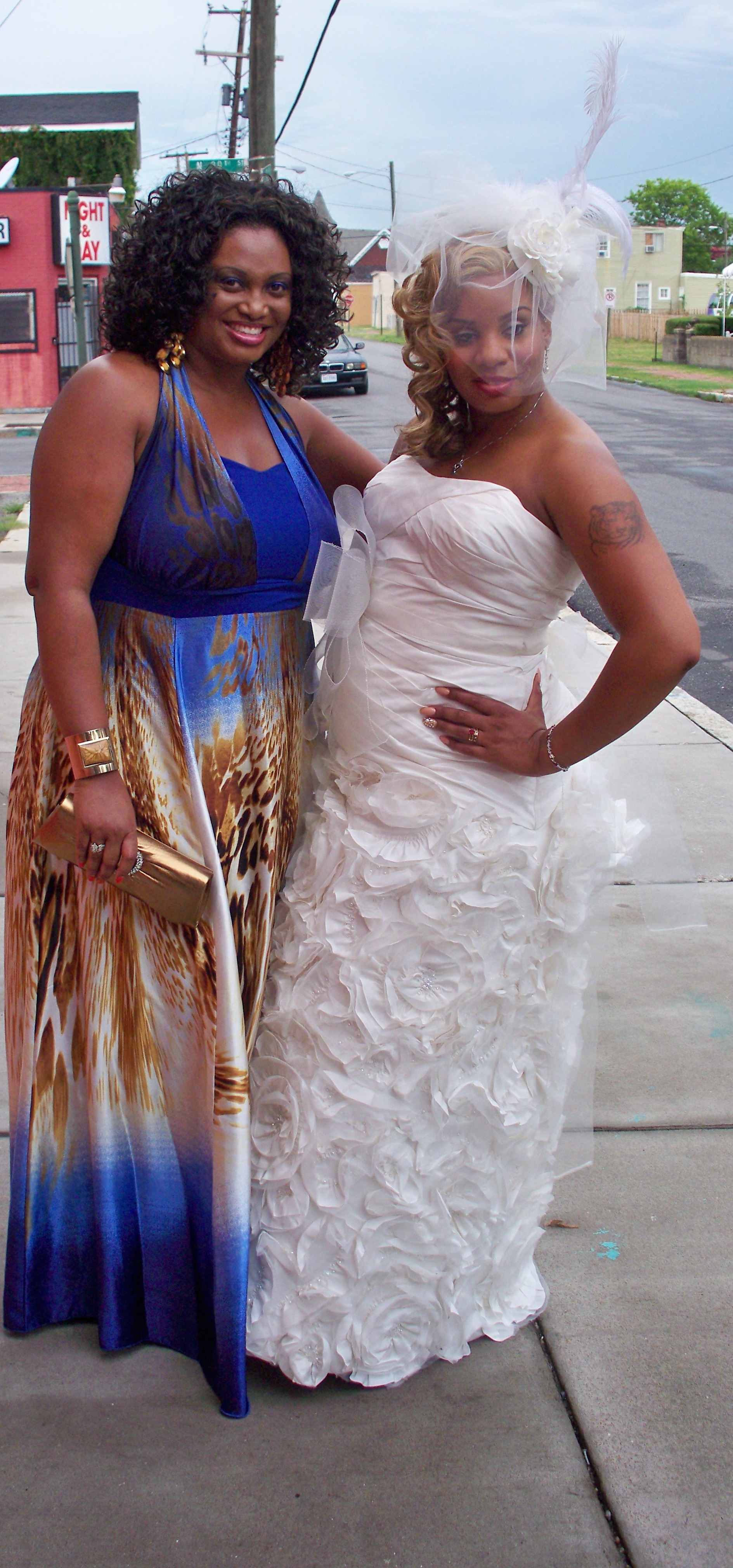 Today I attended my friend/make-up artist, Manaya’s, wedding. Boy oh boy was she a beautiful bride as you can probably imagine by her being a makeup artist. Everything from the hair, face to the gown was perfection. She had sent me a preview pic of her gown and headpiece weeks ago and it was a straight couture look. She told me that she wanted to go for a Carrie from the “Sex and the City” movie theme. She nailed it to a tee with a huge feathered-headpiece and added a ribbon as a belt to her gorgeous gown. But in addition to the bride being beautiful I wanted to wear something appropriate for the wedding as well. As I posted in my blog on yesterday, “What To Wear To A Summer Wedding”, I didn’t want to overdress nor be too casual. So I went for a sure winner by choosing an IGIGI by Yuliya Raquel long maxi dress. It is called the “Desert Queen Maxi Dress and was just released a week or so ago. I had originally already chosen another IGIGI dress to wear but this one that I ended up wearing just called my name for this occasion. Manaya and I are known for taken a million pictures at events that we attend so I wanted to be sure that our dresses coordinated today for her special day. Well we did just that and I even “ALMOST” caught the bouquet too, I got a leaf off of it so I’m good, lol