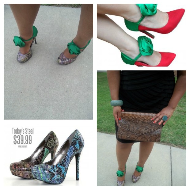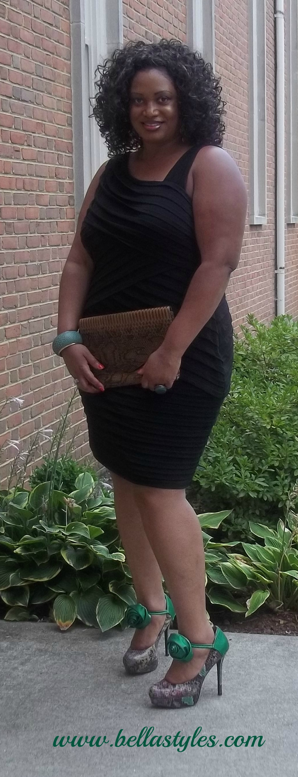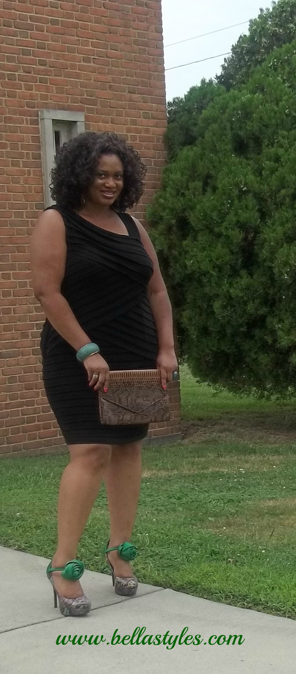 Anyway I suggest a basic black dress for a first date because it’s not over-powering in color and this particular style dress shows off your curves but not in a provocative way. You can always wear a few key accessories to jazz up a plain black dress too. Which brings me to this, “What’s the most important accessory that you must have on a date?”….condoms. Noooooo, get your minds out of the gutter. I’m talking about Heel Condoms. (I had you all going there for a minute didn’t I, rofl). The heel condoms, which I’ve worn before here, are colorful shoe accents that you add to a pair of pumps to instantly change the look of any shoe. I’m wearing my Bakers snakeskin pumps again with the green satin flower heel condom. I figured that it would be a great way to spruce up the shoes to show your date that you are both classy with the black dress but can also be stylish in some fierce pumps. Plus when you two are on the dance-floor all eyes will be on you and your shoes….oh and maybe your date too 🙂