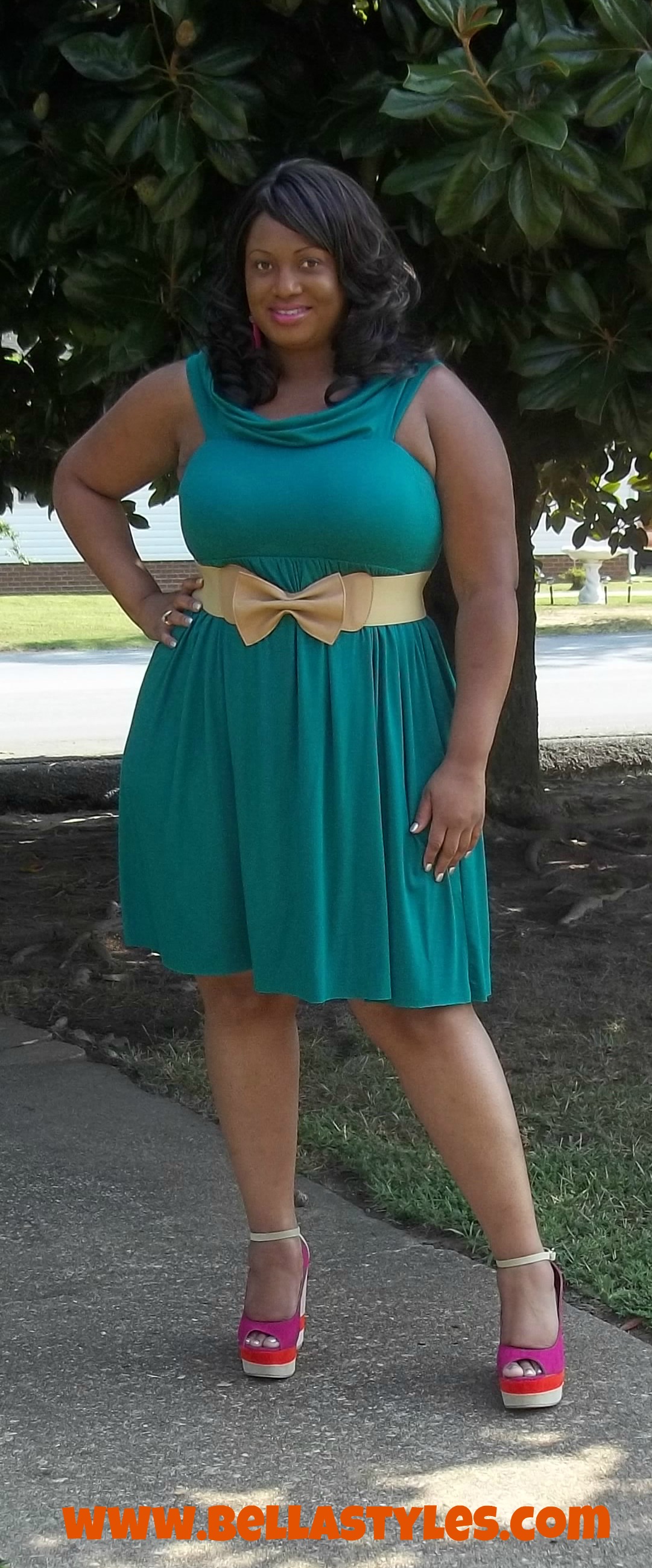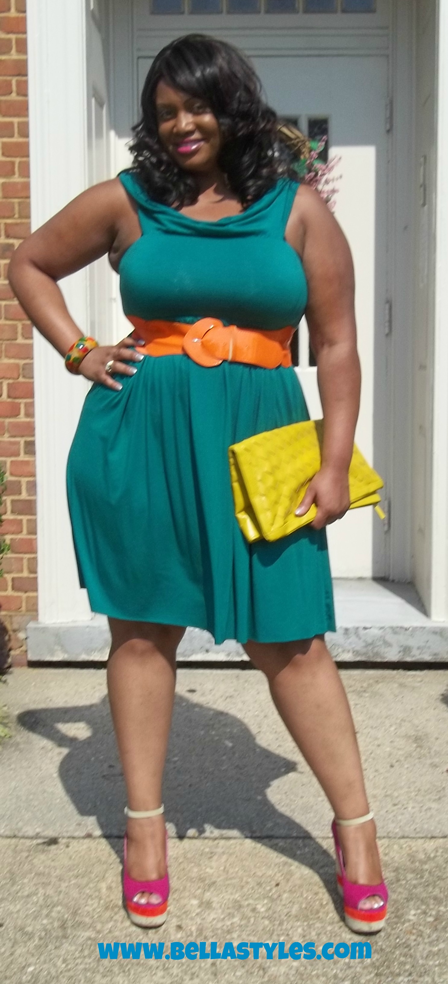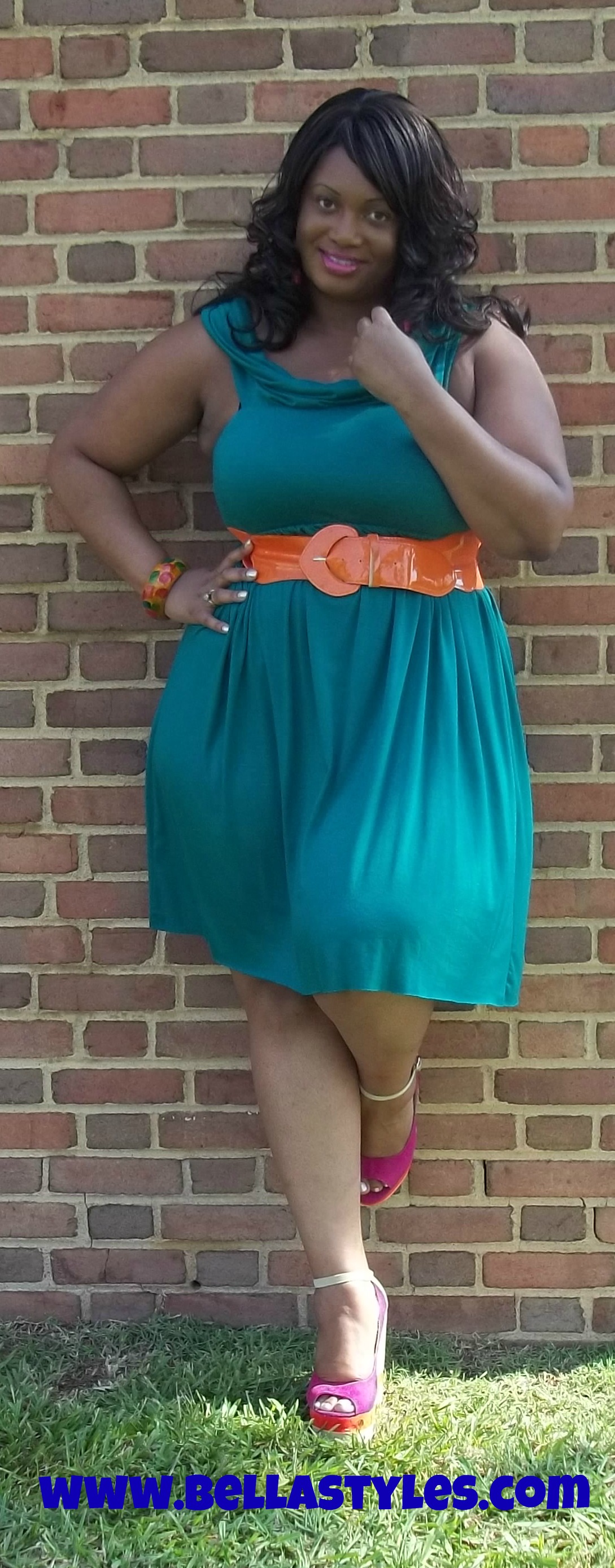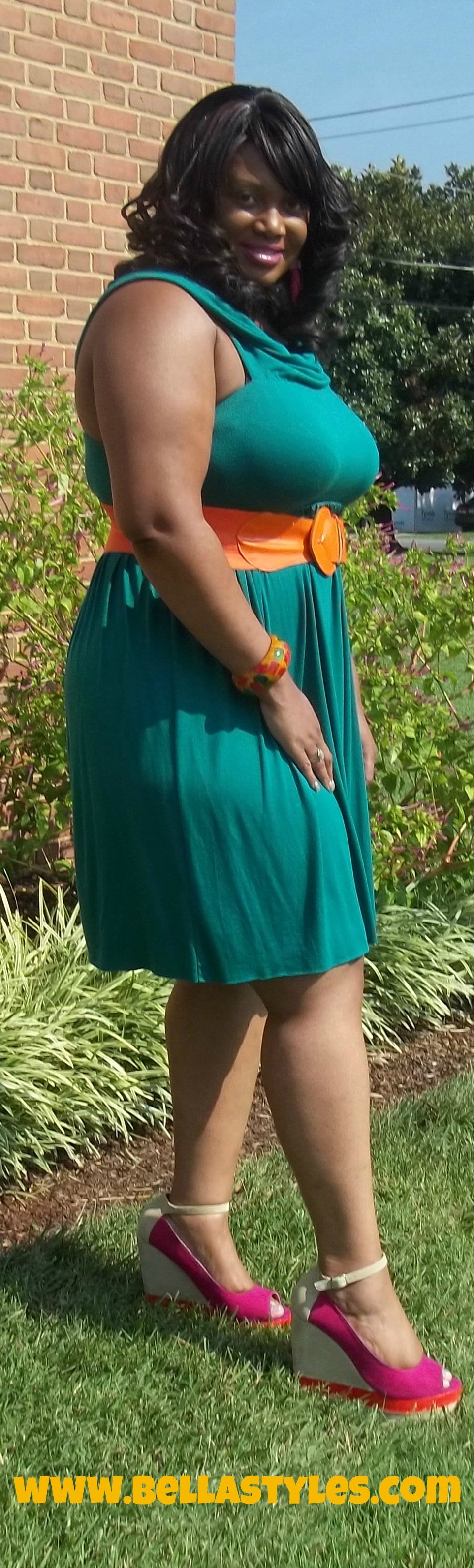 Today I’m wearing a dress by designer Rachel Pally. I’ve had this dress in my closet since around January and felt it was warm enough today to pull it out. It is called the “Ziggy” dress. This dress can be worn both off the shoulders and on the shoulders, I chose to wear it on my shoulders today. It is a teal greenish color so I added some colorful wedges and an orange belt to it. That was my rainbow look. Then later on I switched up the belt and jewelry for a more neutral look. Which look is your fave?