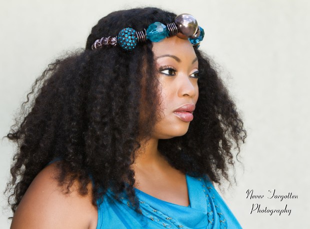 For our first look I used all Ashley Stewart clothing and accessories to create an “Egyptian Goddess” look. Now I must be honest, this didn’t start off as an Egyptian theme. But the necklace clasp wouldn’t open up so we decided to just wear it as a headpiece which turned out perfect to frame Liris’s face. Liris is wearing a teal embellished tank ($24.50) and black peplum skirt ($29.50). The bracelets and clutch are by Ashley Stewart also.