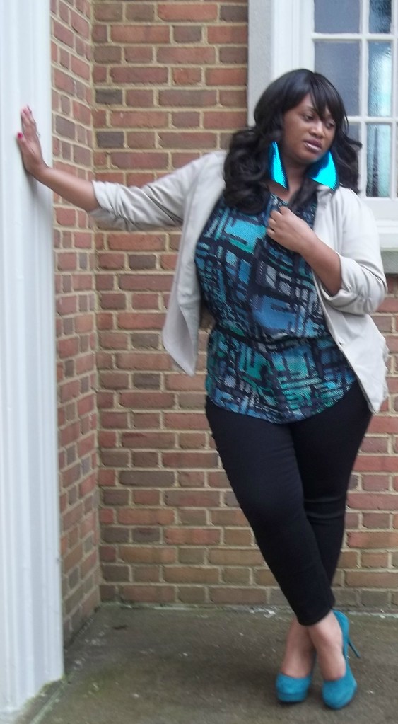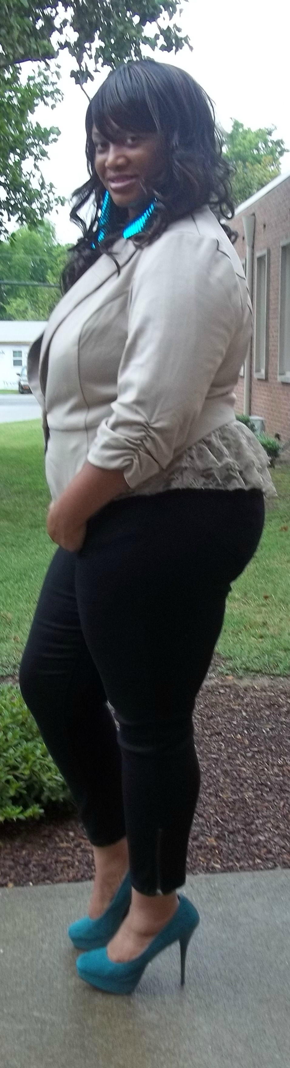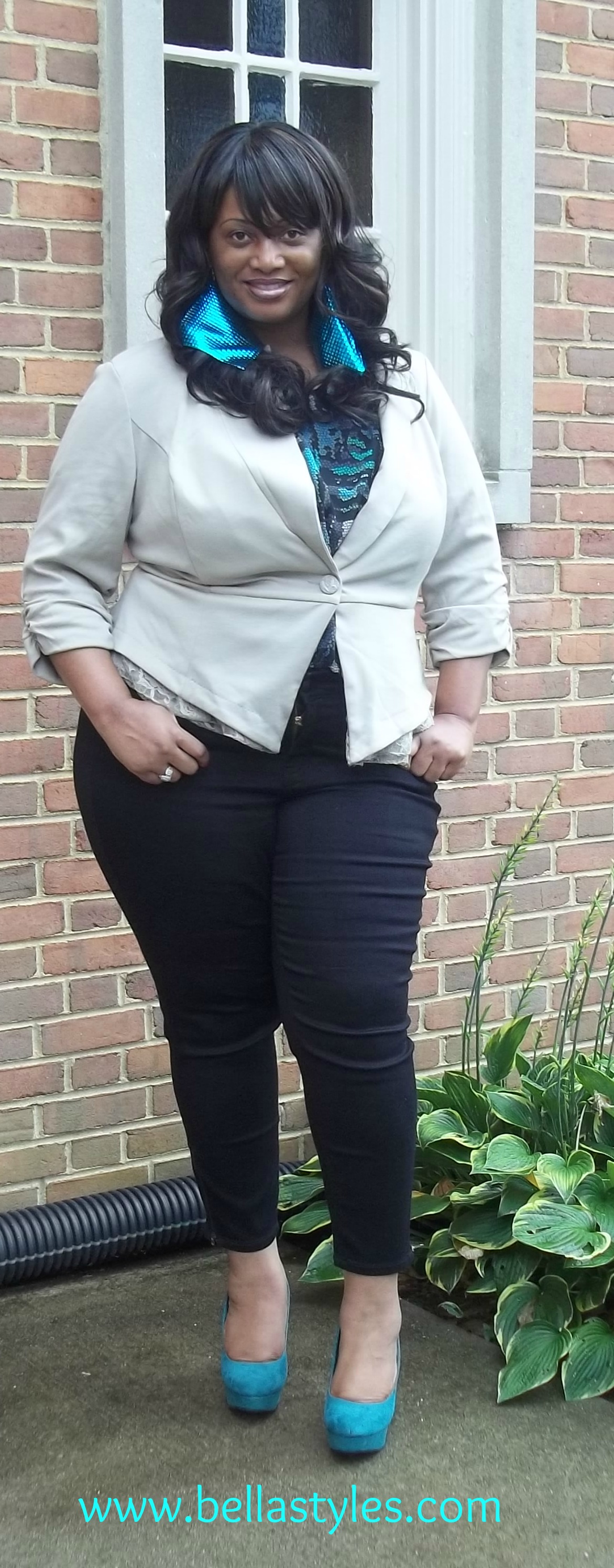 Yesterday I wore a khaki colored peplum blazer with lace on the back from Torrid, my new favorite stiletto jeans and a Miss Tina blouse from her Fall collection for Wal-Mart. This was my 3rd pair of stiletto jeans that I’ve worn in the past week and a half so I’m not stretching the truth when I say that they are the best. I’ve read comments on the Torrid page about them being too short for some and fitting like a capri. Well that’s the beauty of plus-size women coming in all shapes, heights and sizes, they’re gonna fit everyone differently and on some it may look better as a capri or as an ankle length style on others. Luckily I’m on the tall side so mine fit me right above the ankle which I love because my heels aren’t hidden. (Sometimes a gal just wants to show off her pumps, lol). Khaki pretty much goes with anything so since it was a little rainy out yesterday, I added this blazer over the sheer shirt and came up with this ensemble below:
