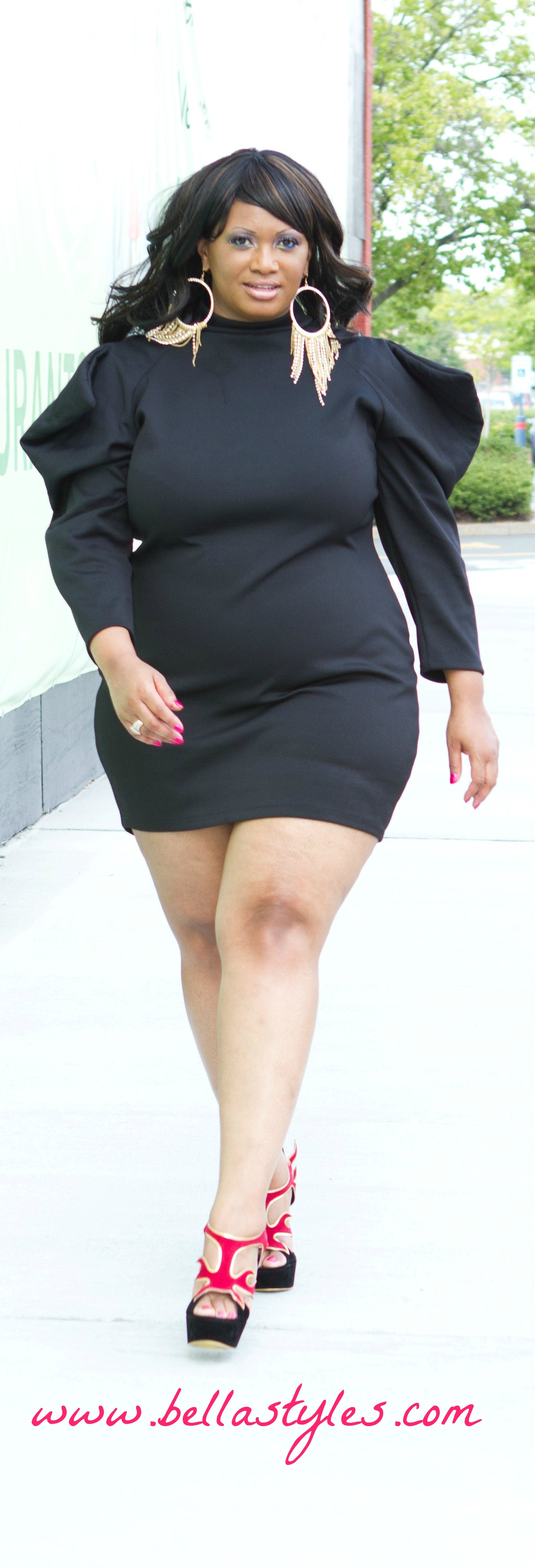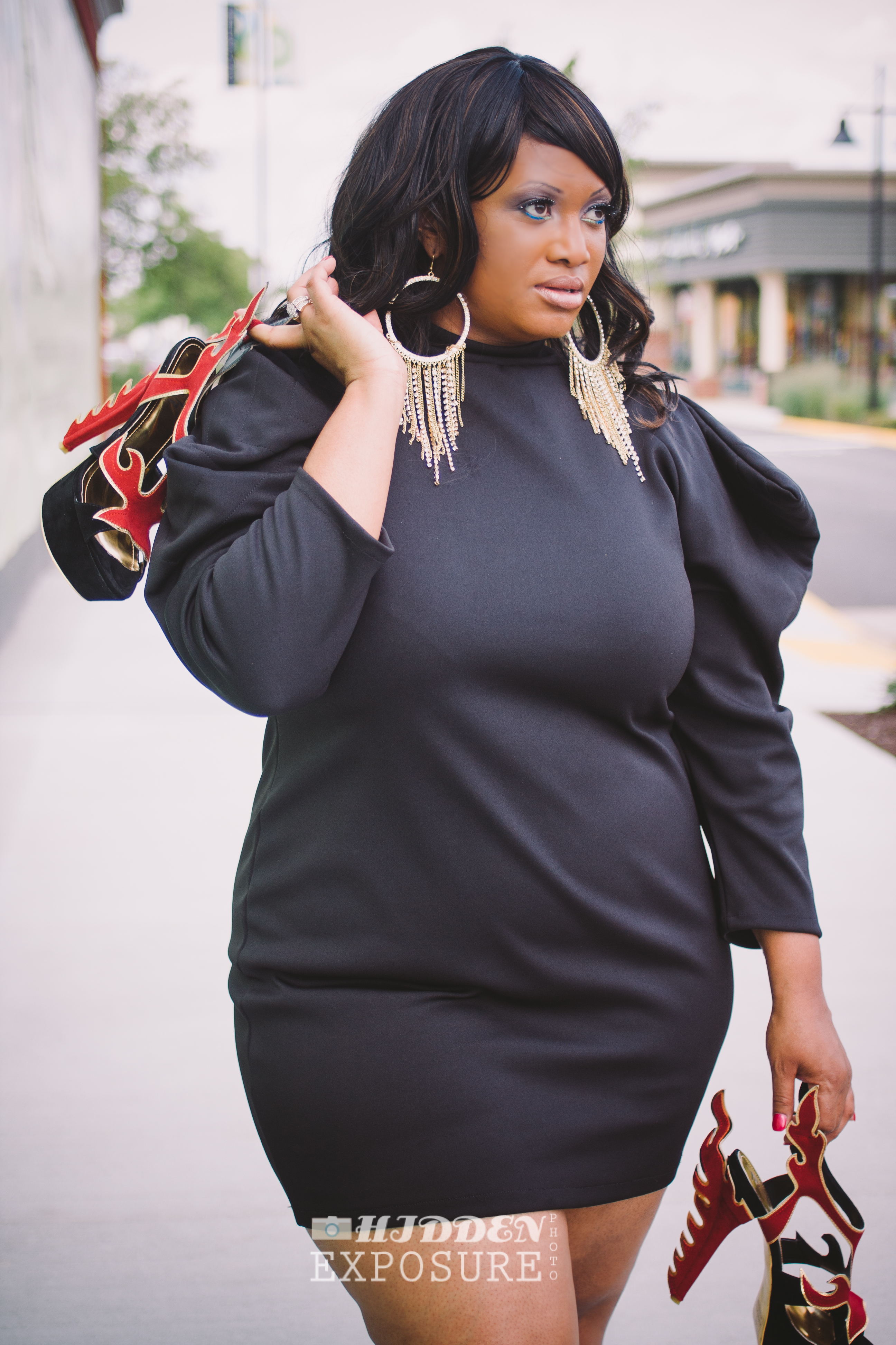On a recent photshoot that I did with photographers Jaime of ‘Hidden Exposure Photography’ and Doug of ‘Never Forgotten Photography’, I wore this unique black dress from Memphis boutique, Dean of Fashion. The dress is called “Attention” and that’s exactly what you’re gonna get when you wear it. We did the photoshoot outside of the store where we had just held a fashion show and passersby in cars were stopping and complimenting me on this dress and of course the shoes. I first saw model Joy Tribble wear this last year for a photospread and I was like I’ve gots to get my little paws on that dress. It’s no secret that I admire singer Rihanna’s daring attire and this dress put me in that mind frame of a Rihanna or Monica inspired look. The statement shoulders are reminiscent of a costume from a sci-fi movie and the form fitting of the dress gives it a certain sexiness. Since my ‘Flame Inspired Sandals’ were another eye-catcher, I only wore a pair of bold gold earrings to compliment the gold in the shoes.
