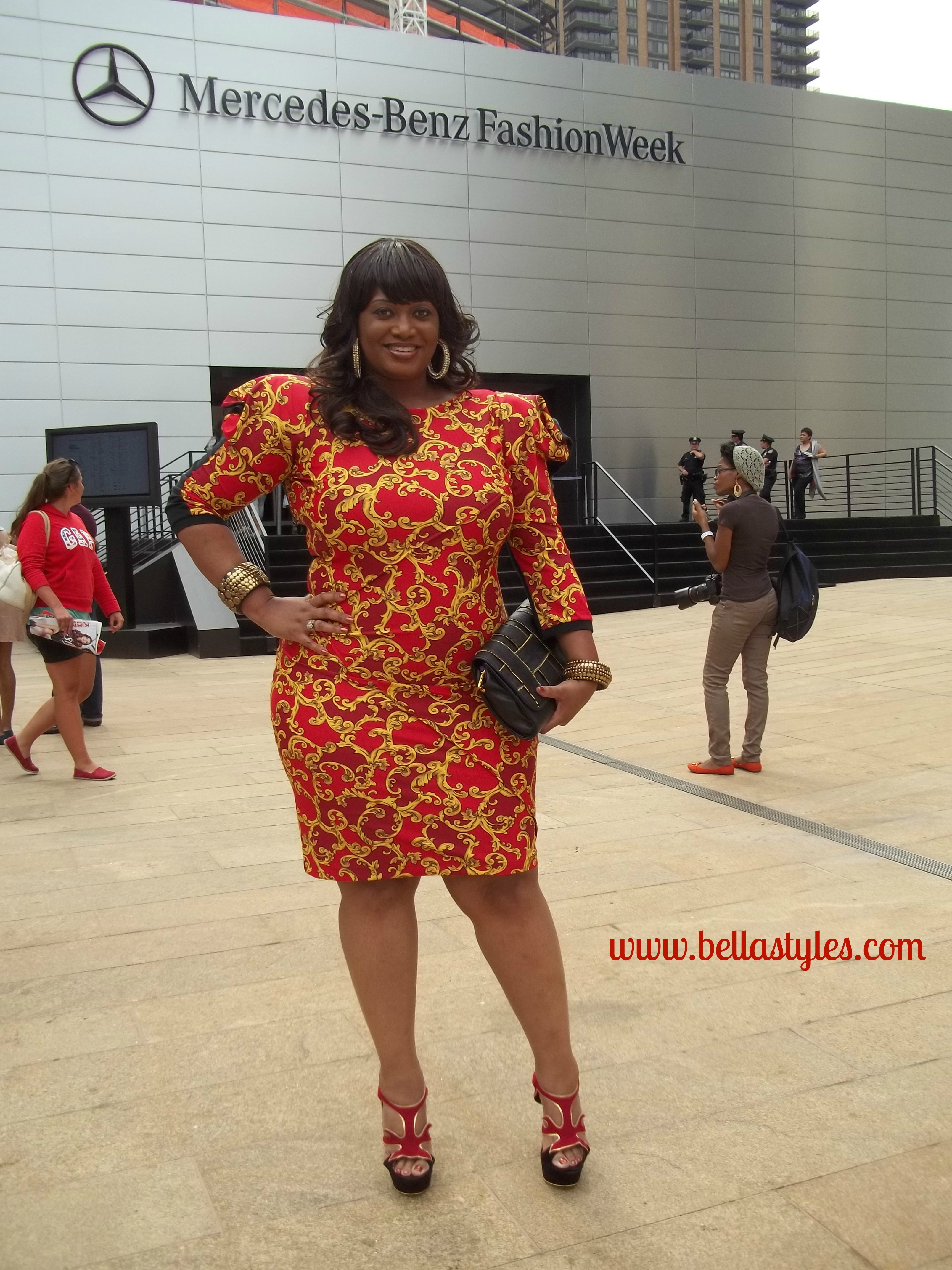 While attending the New York Fashion Week Runway Show on yesterday, I wanted a knock-out outfit. Very seldom do I wear an item more than once especially if it’s really unique. I figure once it’s been seen it’s no longer a thrill to me. (I wouldn’t suggest that for my readers though because it can get expensive. That’s just one of MY personal little pet peeves as a blogger). But I’ve had this NaKIMuli dress in my closet since 2010 and I’ve only worn it once before. I love NaKIMuli’s African inspired designs and how she puts a trendy twist to them. But the great thing about this number is that it can be reversed. Although I didn’t reverse it I wore it again because it matched my Prada Flame look-alike sandals perfectly. I was originally gonna wear this to the Wendy Williams Show but once I re-read her dress code guidelines, I realized that this was a little ‘too busy’ for TV but perfect for Fashion Week. I just matched up the red, black and gold from out of the sandals with those exact same colors in the dress. Being that it was also my first time there I was so thrilled when other attendees were stopping me to take pics of my outfit and shoes. (Let me know if you see my pics on other sites too, wink wink)