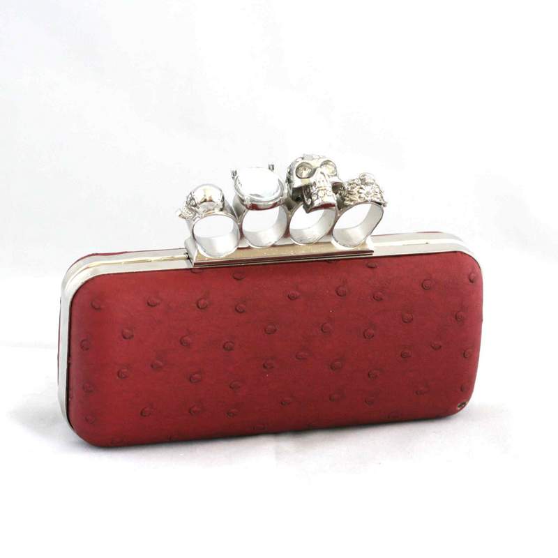 If you opt for the burgundy sandals, this clutch will go great with them: Ostrich PU Leather Skull Knuckle Clutch – Red, $39.99