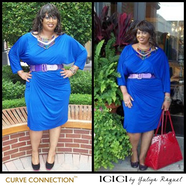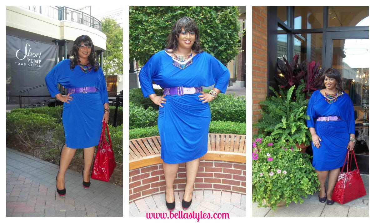 I had been debating all week on what to wear to today’s fashion show with celeb stylist Clinton Kelly. Since the weather was so warm out this afternoon I decided that rather than wearing my original faux-leather outfit to opt for my go-to designer IGIGI by Yuliya Raquel instead. This is the dress that I was supposed to wear day before yesterday for my Birthday dinner but my plans were changed, so instead I wore it today to the show. I always say that my favorite colors are purple, pink and turquoise but now I’m starting to think that royal blue is taking over my wardrobe. I recently wore another IGIGI favorite, the Ambrosia dress, and that was blue too. The one that I had on today is called the Mara Dress and is a fully-lined, boat neck jersey dress. The sleeves are dolman and there is a side-draping detail that diverts attention away from the tummy area. I added a belt to the dress to not only compliment the blue hue but to accentuate the waist area as well. I paired up the dress with a statement necklace and matching earrings with the colors of blue, purple, green and red in it. I’m actually carrying a laptop case as my purse because I always have so much stuff with me that a regular purse just doesn’t cut it anymore. Let’s just say that this blue is my lucky color or that this dress is a standout because I happened to snag a pic with the man himself, Clinton Kelly, while he was doing his book signing after the fashion show. (P.S. fans were supposed to be only allowed to have him sign their books and not take individual pics, but I was able to get his wonderful security to actually let me take a pic with him standing beside me, wink wink. I’m so ecstatic right now but I will give details later).