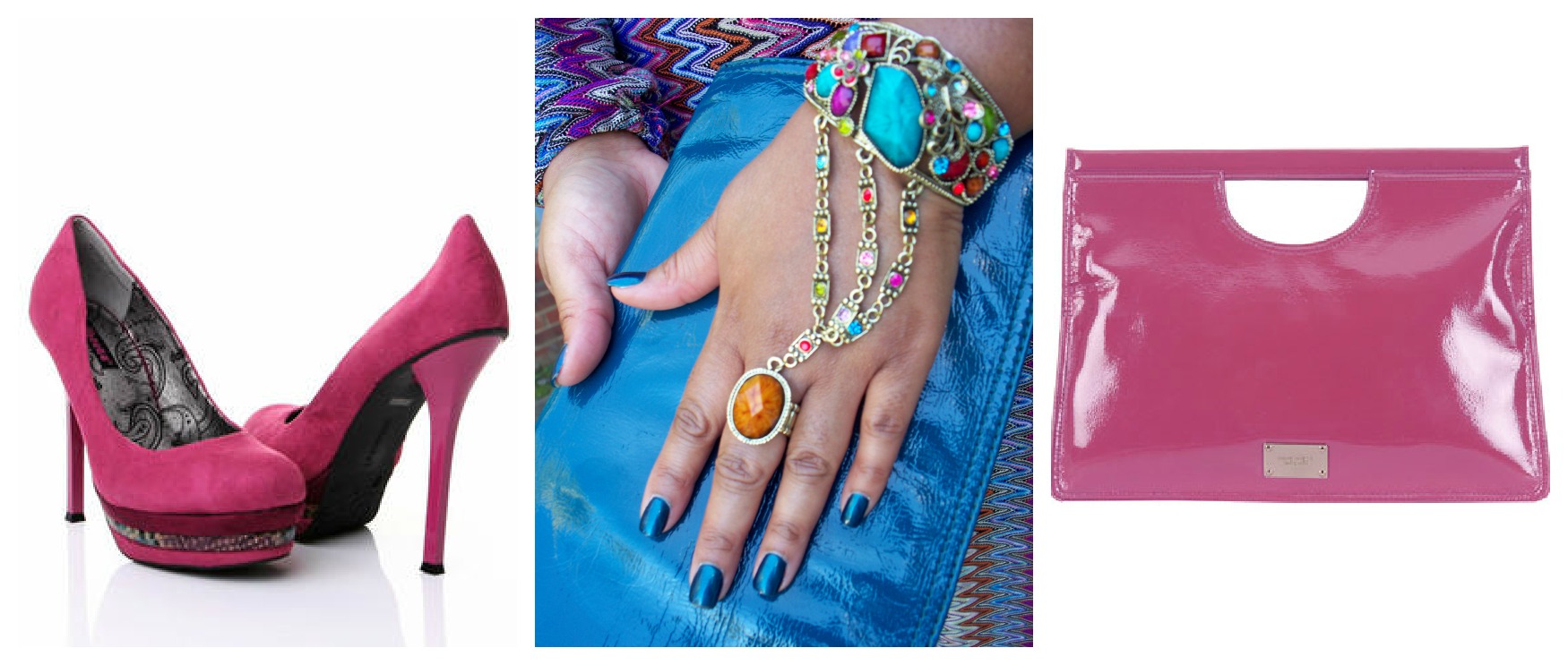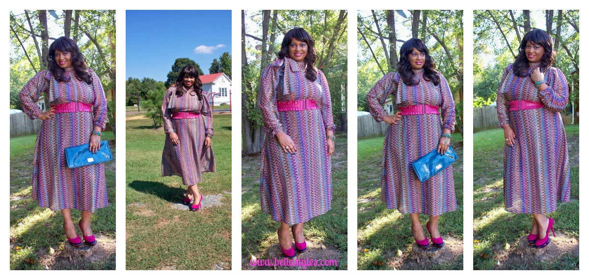 Today I’m wearing a dress that was gifted to me from designer Veronica Lipscomb of Tru Diva Designs. You may remember I featured her clothing in a previous post. This dress is made of a sheer multi-colored fabric with a tie-bow on the right shoulder. Even though the dress is sheer it isn’t a thin material, which is good, but I wore a black slip underneath just the same. (That’s the old-lady in me, lol). By it being long-sleeved, now that it is the Fall season, it was the perfect time to wear it. I really like the Mossimo inspired zig-zag design in the pattern. The dress is an A-line design so to accentuate my waist, I added a wide belt in the color of fuchsia and shoes to match. The dress is called the “Marilyn” after Marilyn Monroe, thus the A-Line design. With the tie-bow neckline and long sleeves not much jewelry was needed. Which gave me the opportunity to finally wear this bracelet/ring combo that I purchased in New York earlier this month. I have been watching this new jewelry trend and was eager to try it out for myself. But you have to wear it with an outfit that won’t call for a lot of accessories. So that’s why I wore it as my only jewelry today.