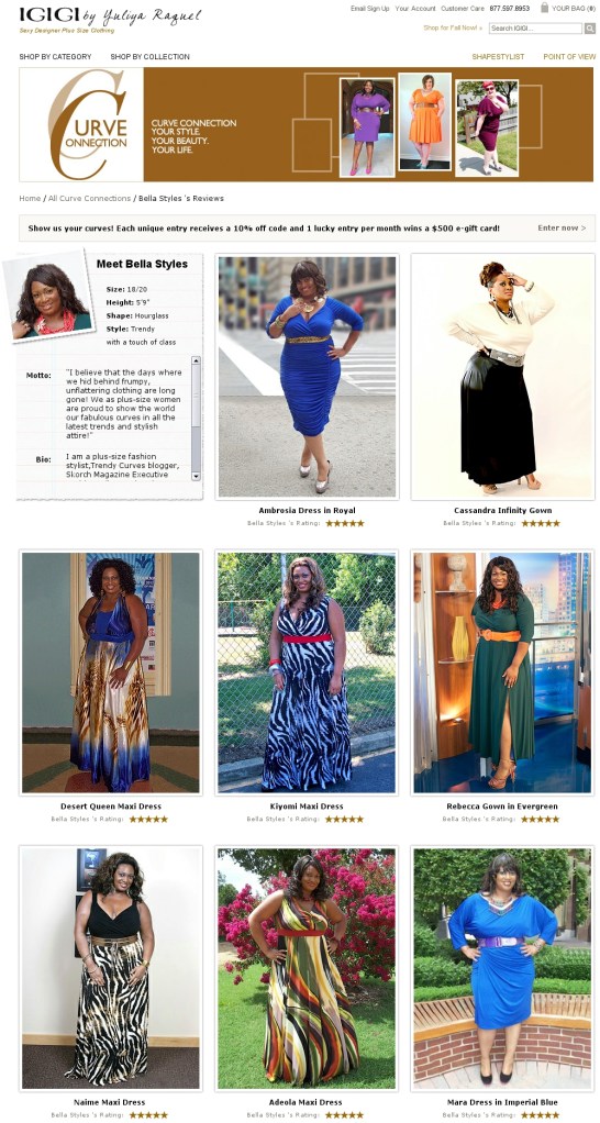 So it pays to REALLY be a fan of top designers in the plus-size world. Designer IGIGI by Yuliya Raquel has just released a project on their site entitled the “Curve Connection”. Curve Connection™ is IGIGI by Yuliya Raquel’s new community of fans showing off their favorite IGIGI designs and showcasing them for other real beauties worldwide. Each participant has her own page where her size, shape, bio, and her motto as a curvy beauty are laid out along with her pictures and her experience with the design. IGIGI by Yuliya Raquel started this new feature to show the designs on real women in addition to professional models so that customers can better decide for themselves. Myself and a host of other curvy bloggers showcase our IGIGI outfits in our own unique styles and the customers can then click on the links to purchase the items right away. Attached below is the press release and checkout the quote from yours truly: