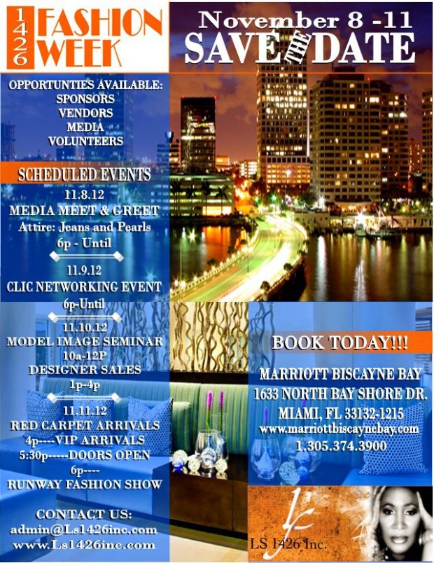 1426 Fashion Week, being held at the Marriott Miami Biscayne Bay, 1633 North Bay Shore Dr., Miami, FL 33132-1215, on November 8-11, 2012. Hosted by LS 1426, Inc., Contact: Linda Scott, (888) 682-1615, www.LS1426inc.com