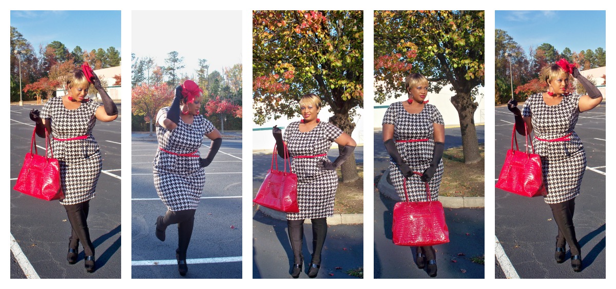 In this month’s newest issue of Skorch Magazine all of the editors and contributors were asked to do an outfit of the day post inspired by a musician. I chose Lady GaGa’s houndstooth outfit for my inspiration. I had seen her wear this ensemble some time ago and although head-to-toe houndstooth was a bit much, I dug the concept. Last month I happened to stumble upon the dress that I’m wearing while doing a search on the Wal-Mart website for Miss Tina apparel. Now my dress is not by Miss Tina but rather a designer named Alexis Taylor but it popped up under the search. The dress retails for only $19.88 and incorporates the current trends of peplum and houndstooth. The dress has pretty good stretch material in it for the price and the peplum accent is perfect for that added figure-flattering effect. I took it back old school by adding the lil’ top hat and long gloves in some of the pics. But my over the knee boots were Lady GaGa all the way since you can’t really tell if they’re leggings or actual shoes, hah.