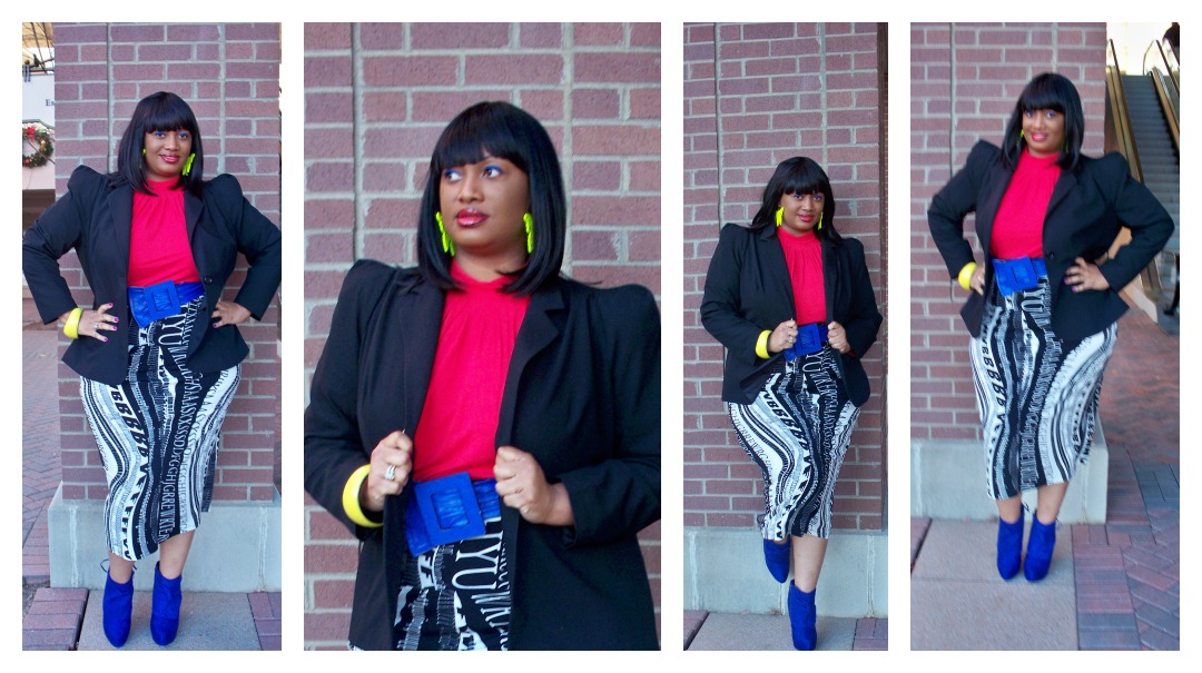 Last month a rep from the Netherlands plus-size retailer Yoek contacted me about their new upcoming Black Label. Yoek is a quality brand for all fashion loving women with a plus size. Yoek creates fashionable clothing with a beautiful and feminine flair. Yoek has a clear idea what fashion in size 38 – 58 should be: Clothes which do not hide the figure, but make every woman look wonderful. While researching their website I came across this skirt with letters (€89.00) that caught my attention. Although it is not from their Black Label I chose it because it took me back to the days of Sesame Street and learning my ABC’s. The skirt is a stretchy pencil style with a overlap at the waist area. The sizing options go from a size S (12/14) -Plus(28-30). So this week my skirt arrived to me and I couldn’t be more impressed with the neatness of the packaging and pretty bow on top for me. Since I seem to be wearing a lot of black & white in my daily routine here lately instead of just throwing plain ole red with it I opted for some blue as well. I wore these hot new Torrid Cobalt Blue Lace-Up Booties ($54.50, Sizes 7-13), a red long-sleeved Michael Kors shirt (Macy’s) and my fave black Simply Be blazer. To compliment the booties I added a blue wide belt from Dots then completed my look with an added splash of color by wearing a yellow bracelet and earrings to match that.