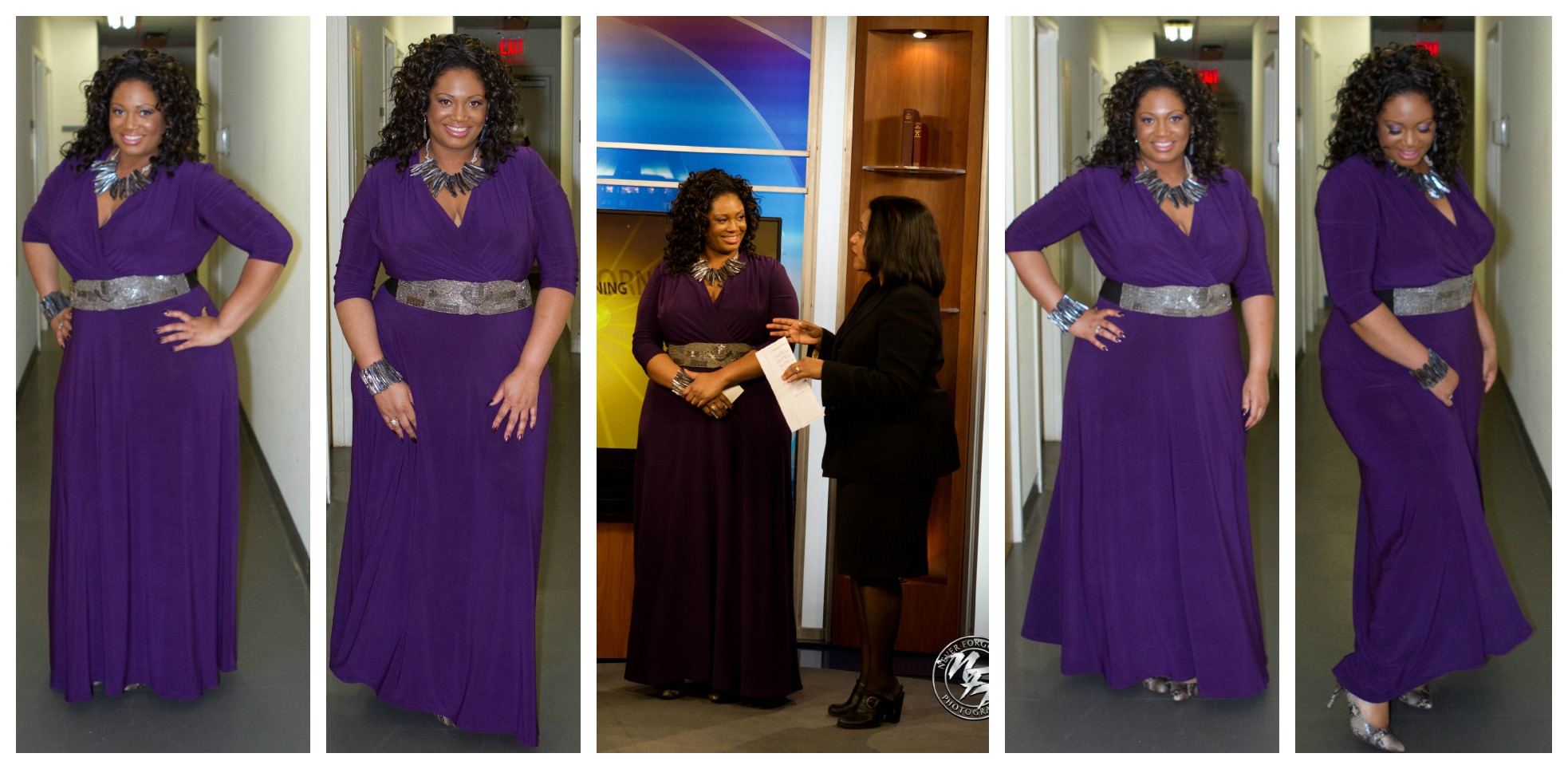 For my interview this past Friday for CBS “Virginia This Morning” I wore this Sevilla Dress in Plum by Eliza Parker from sonsi.com ($229, Sizes 0X-4X). I chose this dress for one, because purple is my favorite color (as I’ve said many times before here on the blog & on air) and two, I wanted a long classy look for live TV. The color is described as plum on the website but it’s more of a purple hue in person. I added a wide Aurora Beaded Belt by IGIGI ($65) and statement jewelry from Macy’s. I knew that most likely I would be standing while on air so I kept my heels low and opted for these Mossimo® Vivian Pointy Heels from Target ($25, Sizes 5.5-11). As I look back over the pics I’m so glad that I went with this ensemble. The color shows up so well on the screen and wasn’t too overpowering with the statement necklace.