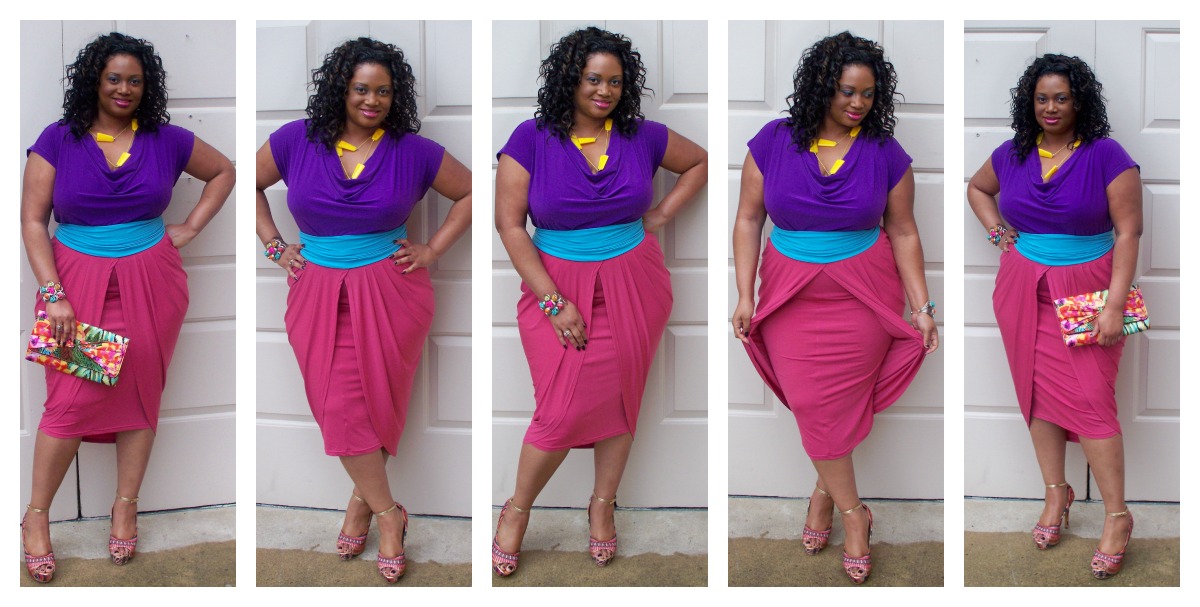 I woke up Monday morning to a beautiful rainbow in the sky. It put me in the mood for spring attire. But unfortunately it started raining right afterwards and has rained non-stop since and that put a holdup on my outfit post. So today I said the heck with it, I was gonna wear my new spring attire anyway just to brighten the fashion mood. The folks over at Chinoo sent me an array of items from their new collection to do a review on. Chinoo Designs was one of the featured designers during last year’s Full Figured Fashion Week in New York City. Today I’m wearing the Jersey Cowl Neck Blouse with Cap Sleeves, $44, Sizes L-3X in purple and the Jersey Skirt with Pleated Overlay, $89, Sizes L-3X in pink. I paired it up with the turquoise bandeau belt. The belt is neat because it looks like a tube top but can actually be folded down as a belt. All of the items that I’m wearing are interchangeable and made of a jersey material that is iron-free. This makes it great for traveling. I actually switched clothing a few times then mixed and matched with a couple of more Chinoo pieces too, but I will share those at a later date. For now checkout my ‘rainbow skittles’ color-blocked combo featuring the designs of Chinoo: