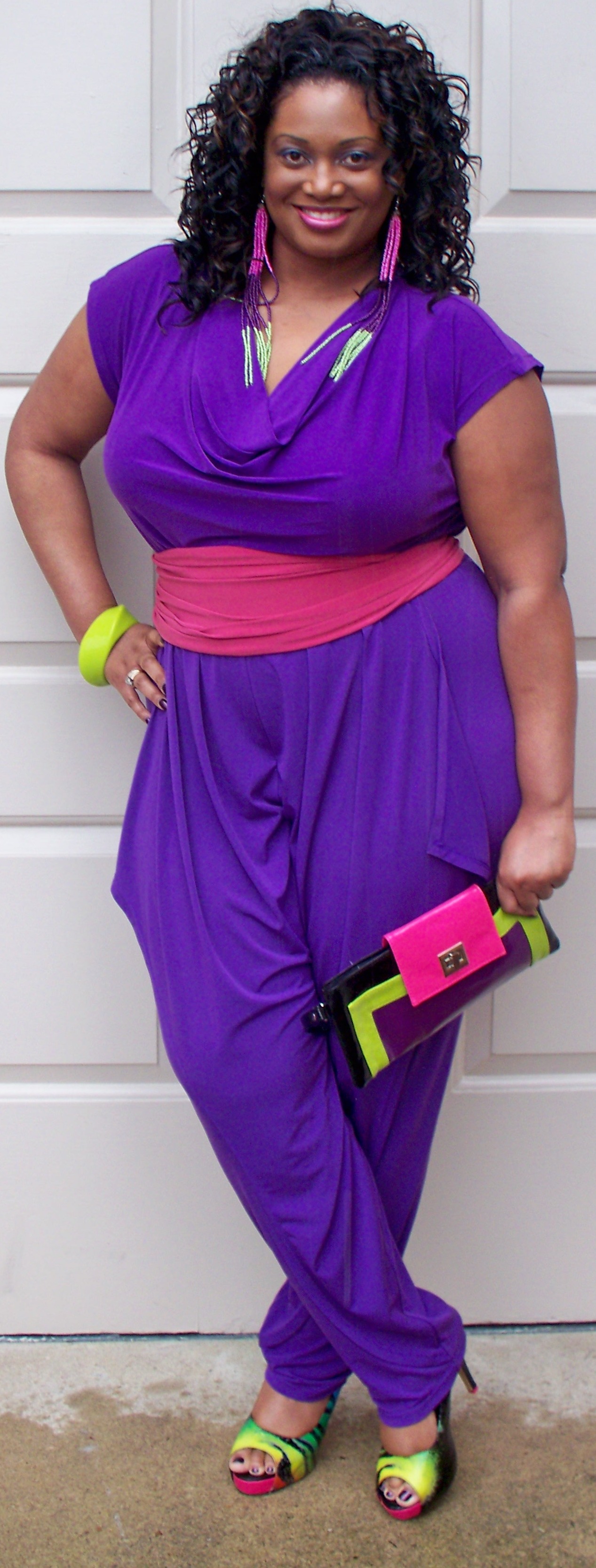 Early last week I featured designer Chinoo on a blog post. I was wearing a Jersey Cowl Neck Blouse with Cap Sleeves, $44, Sizes L-3X in purple and the Jersey Skirt with Pleated Overlay, $89, Sizes L-3X in pink. So today I’m featuring the other Chinoo pieces that I also had changed into while shooting the pics. Chinoo had this jumpsuit on their website that I was really feeling so I got that sent to me. Just like the first outfit that I wore, once I got the jumpsuit in hand, I realized that it too was interchangeable. It is not a one-piece but instead a cap-sleeve blouse such as the previous one that I wore, a belt and a pair of Jersey Pants with pleated overlay flounce, (L-3X), $96. That was right up my alley. I quickly swapped out the purple belt and added the pink belt to create yet another color-blocking ensemble.