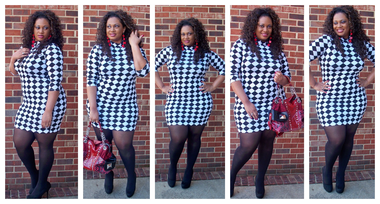 I know that I’m always going on and on about getting the look for less but I just had to share with you a trendy affordable find that I recently came across. I am totally head over heels for the Spring 2013 Louis Vuitton check print trend. I have already started filling my wardrobe with different pieces featuring that pattern. First up is this Turtleneck Checkered Print Mini from Posh Shoppe, $29.99. I have already seen this dress pop up on different boutiques websites (both plus-size and straight size) and although I normally don’t go for dresses of this length, I figured I would still try it just the same. (I need to switch up my personal style from time to time too). Now just as it says on the website, the dress does run small so I would suggest going a size up. Being that it is a mini dress and I’m conscious that I have large thighs, I wore basic black tights (Ashley Stewart, $10) and black pumps (Charlotte Russe) to give a long lean leg look. (I learned that from Wendy Williams). But I just had to throw in a pop of color to round everything out so I added these red square earrings that I just picked up from It’s Fashion on clearance for only $2.99. The red purse is a Nicole Lee find that I got from Bakers Shoes some time ago. Hey although most top designers don’t cater to us plus gals just yet doesn’t mean that we can’t keep up with the trends. Thanks Posh Shoppe for staying ahead of the (curvy) fashion game!