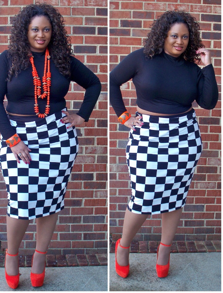 For this month’s new issue of Skorch Magazine bloggers had to re-create a high-fashion look. (I’m on page 35 btw). Now I submitted my pics weeks ago and have been eagerly awaiting for this issue to drop. Mainly because I didn’t want the skirt that I’m wearing to sell out quickly, which often happens on the Asos CURVE website, and I just found out that it did, sorry. Secondly for the reason that once again I’m living on the edge and showing a little skin. My high-fashion inspiration is from the Louis Vuitton Spring 2013 check-print collection. Black and white prints are all the rage this season and I stumbled across a plus-size replication from Asos. To keep up with the LV campaign theme, I added a pop of yellow to my ensemble as well. I’m stepping out on the ledge and trying my hand at a cropped top with the trend too. Us Skorchette’s have to be daring and fashionably fierce right?