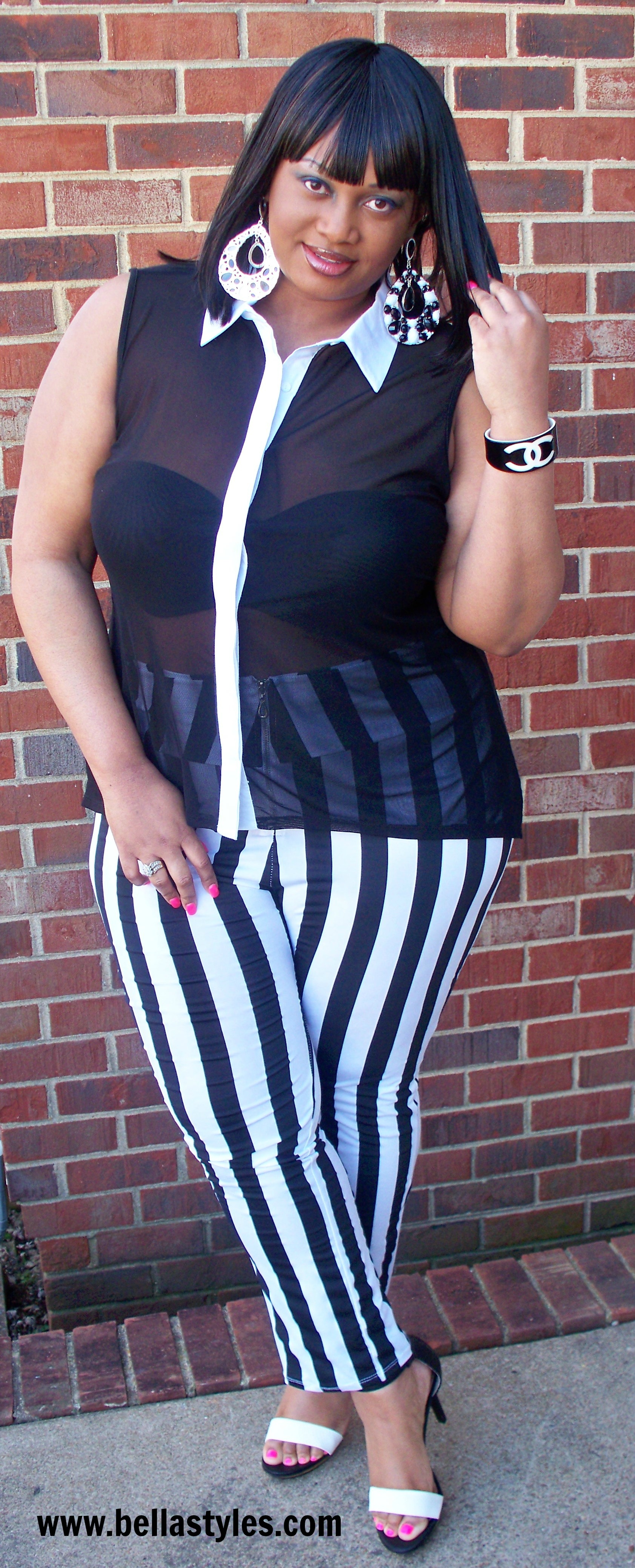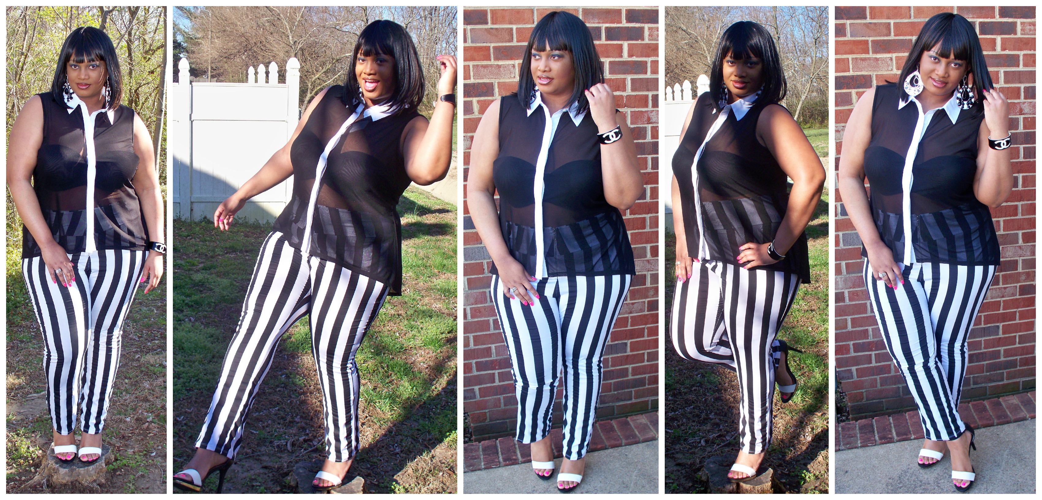 So as I was out shopping yesterday I had a hunch to go to Target for some reason. I’m sooooo glad that I did too. I came across these Mossimo ‘Vinta’ Black & White Heels, $29.99, Sizes 5.5-11 and can you believe it, the only pair I saw was in my size. Then I went to Dots and found this black and white sheer hi-low top, $18.80, Sizes 1X-3X and wore a black strapless bra by Torrid under it and paired it all with the High Waist Zip Up Stripe Pants, ($25.99) that Posh Shoppe had recently sent me. (Similar pair here). Lastly I just added a black & white Chanel bracelet and bold earrings from Ashley Stewart to match all of my other black and white theme.