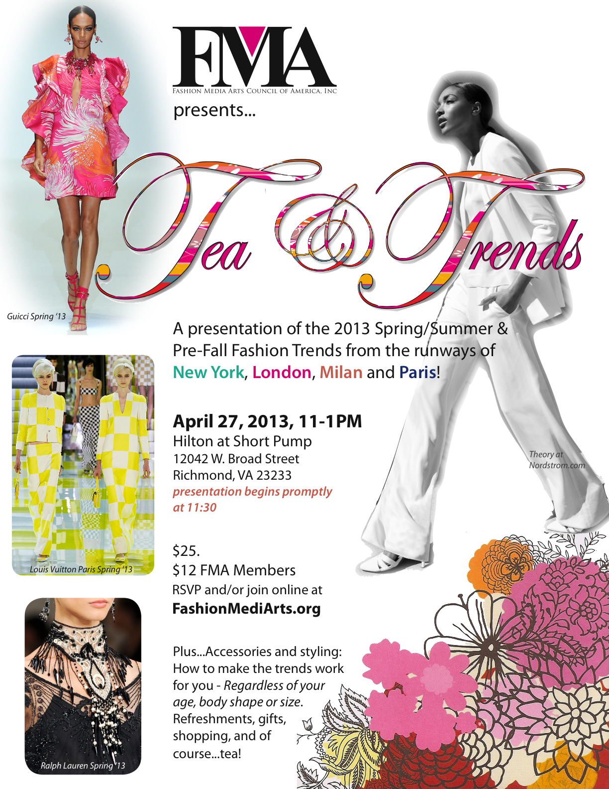 I just love it that my home town is becoming more and more associated with fashion. As I posted on over the weekend, next week starts RVA Fashion Week and this coming Saturday another fashion related event launches. The Fashion Media Arts Council of America, Inc. (FMA) will host a ‘Tea & Trends’ presentation. The event is set to launch on April 27, 2013 at 11AM at the Hilton Richmond Hotel & Spa at Short Pump. Tea & Trends is a presentation of the Spring/Summer & Pre-Fall 2013 Fashion Trends from the runways of New York, London, Milan and Paris. The event includes a multimedia presentation by FMA’s founder, Janel St. John, plus a fashion, beauty and accessory showcase by a number of special guests. Janel St. John, a 1996 graduate of Virginia Commonwealth University’s School of Mass Communications has returned to Richmond after 11 years in the Midwest. Janel founded and published The Conscious Voice Magazine, a quarterly publication covering art,culture, life and style. Now, Janel has returned to Richmond with a new mission. She founded The Fashion Media Arts Council of America, Inc. (FMA), a non-profit 501c3, professional networking organization, to support to fashion, media and arts education, and help raise awareness of domestic violence. “Through Conscience Media, I was able to live out my love of media,” she said. “Through Fashion Group, I was able to live out my love of fashion. FMA allows me to bring those two passions together, under one roof, in a way that gives back to my community and help fight an issue which has greatly impacted my life.” Former NBC 12 news reporter, Cherelle Rodriguez, will also grace the runway as a special guest model.