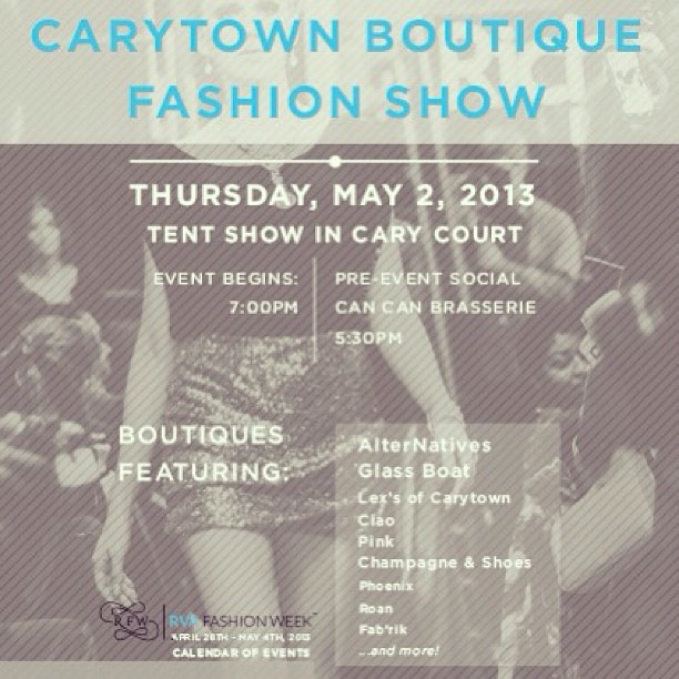 After laying low for the past week due to a bad case of my allergies, I finally dragged myself outta the house tonight to attend the Carytown Boutique Fashion Show for RVA Fashion Week. It was such a beautiful day for a fashion show and the weather was perfect being that the show was held outside. I’m so glad to at last see Richmond and Fashion in the same sentence. I’ve been following the week of events since Sunday via Twitter and Instagram and once I got there I felt like I personally knew some of the familiar faces already. Carytown boutiques such as Pink, Glass Boat and Phoenix showcased an array of fashion ranging from bold hues to more subtle earthy colors. I realized that I must bring back out my neutral pumps because they were a hit on the runway. Here’s a glimpse into my night of RVA fashion: