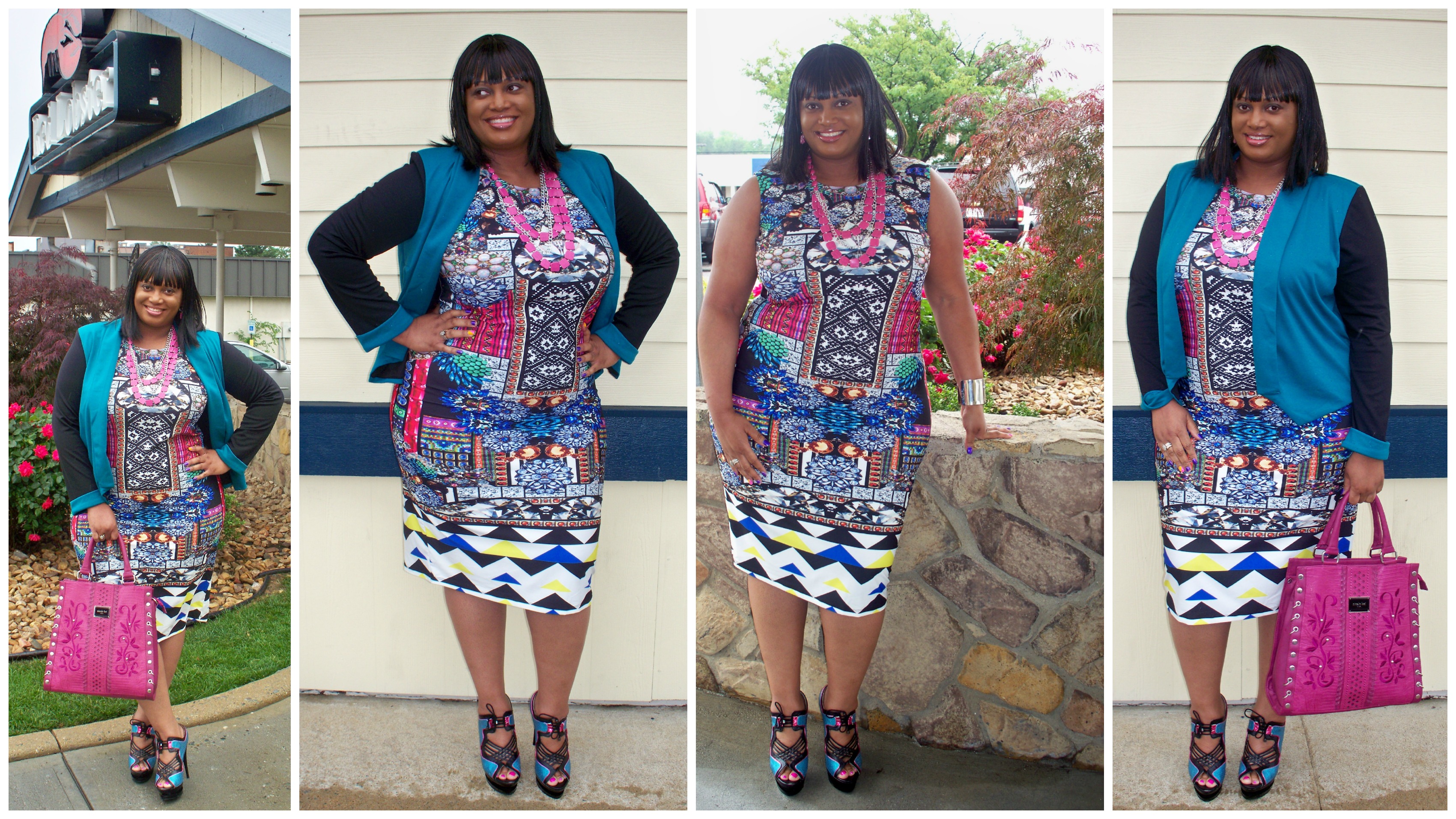 I went to dinner today at Red Lobster with the fam and although I had another outfit on at first, as I was about to leave out the house the postman rung my doorbell with a package from Asos in hand. I had a feeling it would arrive today as it usually takes exactly a week for their orders to come and I placed this order last Friday. So I made a quick outfit change and am wearing the new ASOS CURVE Body-Conscious Dress In Jewel Print ($76) and ING Teal & Black Jacket from Macy’s ($24). I had just received another Asos bodycon dress last week but when this new one popped up on the site, I liked it even better. I absolutely love Asos bodycon dresses because the polyester and elastene material conforms to the body just right. (I added a bodymagic underneath though for secure support). The dress has so many colors in it that you may wanna keep the jewelry to a minimal. Therefore I only added a pink earring/necklace set from It’s Fashion Metro ($3) and silver ASOS Jewelled Cross Cuff ($6). I did however want a statement shoe to go with the dress so I wore these lace up peep toe pumps from Shoe City ($35, 2011). (I also wore them before here). To complete my look I topped it off with a pink Nicole Lee Handbag and then it was time to go Lobster diving, literally!