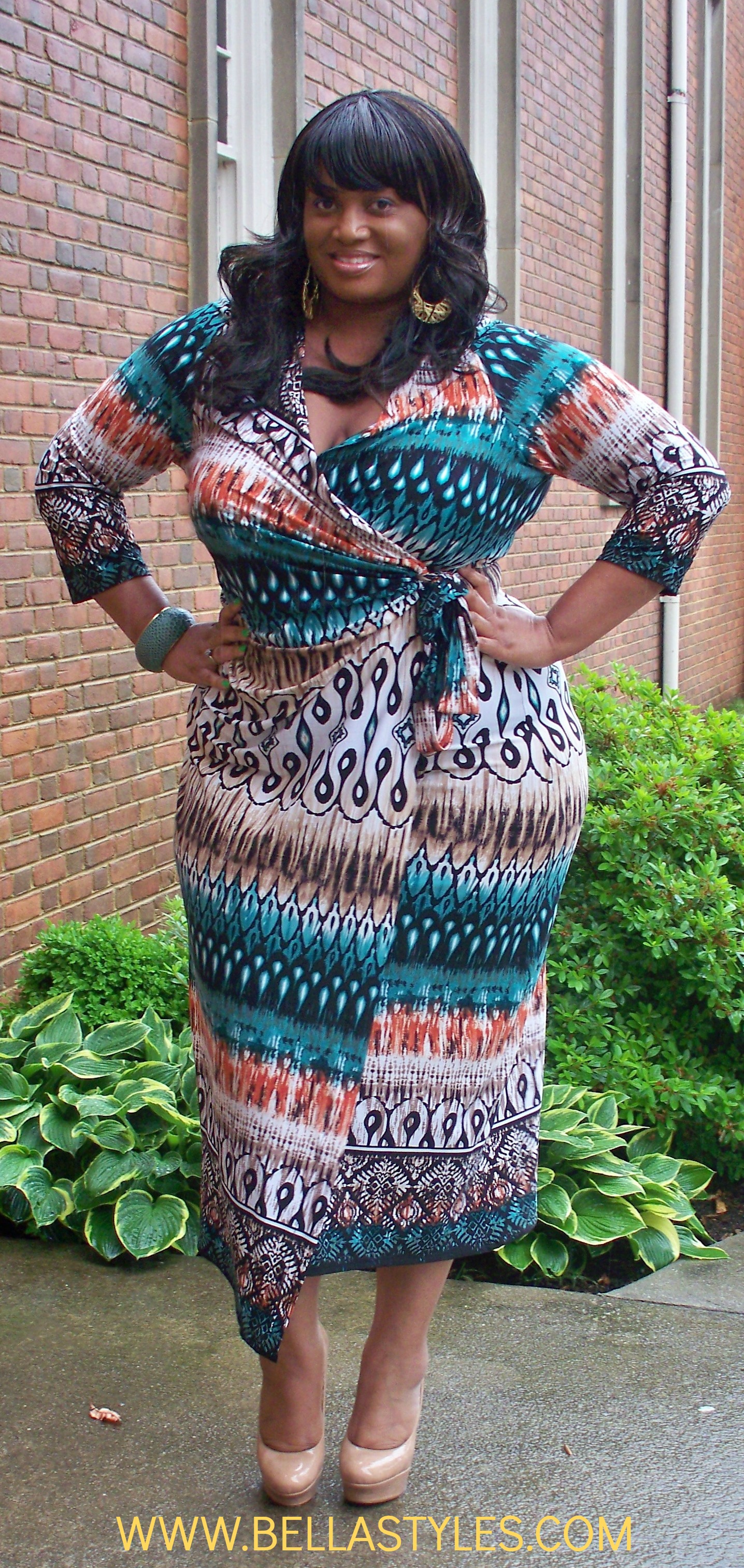 Back in mid-May I introduced my readers to a plus-size designer by the name of Wole’ LLC. Well I also had this dress by them called the Kelly Resort Wrap Gown, $149 that I have been waiting to wear from the new spring/summer 2013 Resort Collection. You see I was saving such a special dress for a special occasion which was supposed to have been last weekend. I had the unique opportunity of interviewing singer/actress Tamela “Cora” Mann when she was here in VA. But due to a scheduling conflict, we were unable to meet. But don’t fret, we have agreed to just do it by phone at a later date, so look out for that. Anyway I wanted to wear something classy yet stylish at the same time for meeting such a highly-respected gospel artist. That’s why I was gonna choose this dress by Wole’. So I’m wearing it today instead to showcase all of the great detailing involved in this design. The dress consist of the color scheme of teal green, burnt orange and a neutral beige which is why I paired up my nude pumps along with it. The Gown wraps in the front, has a side tie, and 3 quarter length sleeves.