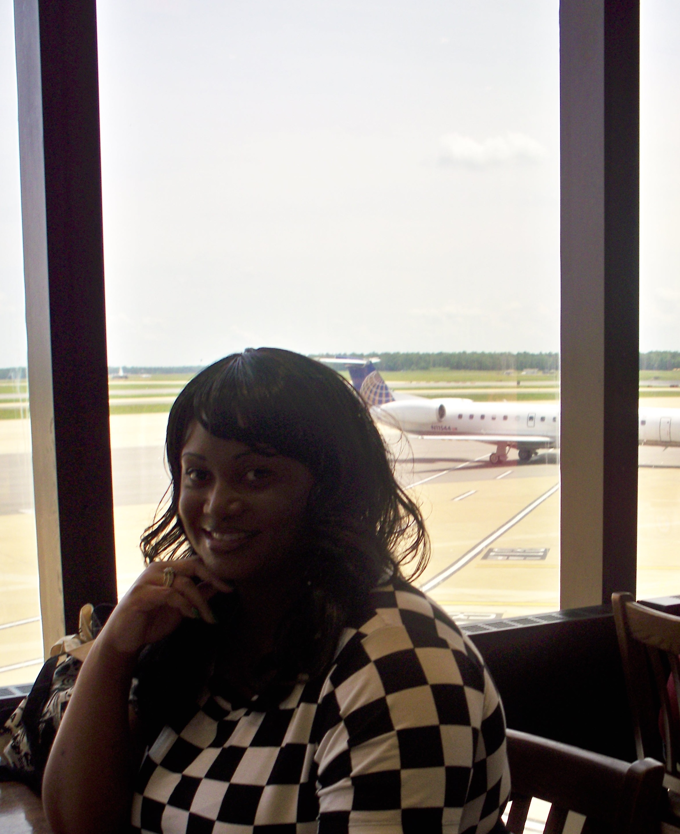 We decided to grab a bite to eat at the restaurant there and I snapped a few pics while we waited. In keeping up with my black and white fashion wardrobe, I re-wore this Letter Skirt by Yoek, €44.50 and paired it with this Check Print Peplum Top by Asos CURVE, $25.46. Now I’m a little on the fence with this overall outfit as I’m still leary of mixing prints but I had to make a run for it this morning as to get a good seat at church so I didn’t have time to rethink my choice. But I did grab this Batwing Fringe Cardigan, Now $10 by City Chic and black Charlotte Russe pumps and a black and white stretch bracelet from Charming Charlie. To cinch the waist I just grabbed this mirror belt from another dress that I recieved from Posh Shoppe. I suppose I should have labeled this “Flight Fancy” but being as though I didn’t actually fly out anywhere, I’ll save that for another day.