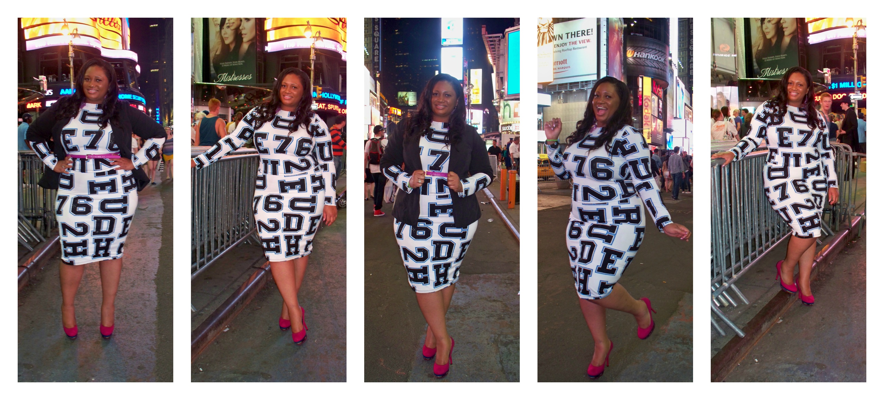 After a full day of events in NYC on Thursday I went out for some family time fun in Times Square. I visited Madame Tussard’s Wax Museum, Ripley’s Believe It or Not, Toys ‘R Us and even caught a little of the game on the big screen in Times Square where my Heat beat the Spurs. I wore a two-piece outfit of a Letterman Crop Top, $23.99 and Pencil Skirt, $29.99 both from Posh Shoppe. The top and skirt are white, black and blue so to add a pop of color I added a fuchsia belt and fuchsia pumps to match that. You can wear the outfit alone for a more playful look or to dress it up a bit, add a black blazer. Times Square is full of lights, people and billboards so I felt like my letter outfit fit right in!