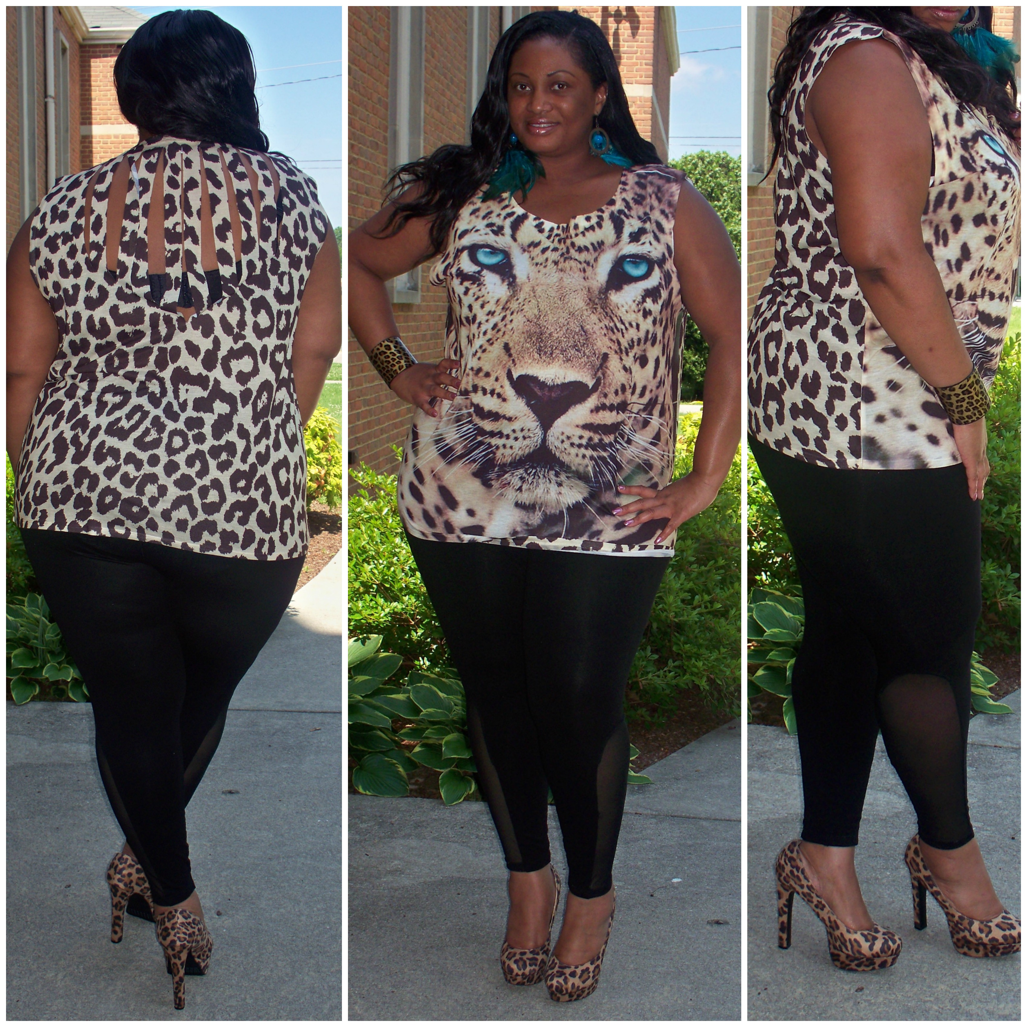 I’ve had this love/hate relationship with Forever 21 for some time now but I always still check their store out when I go to Times Square. I personally feel that many of the plus-sizes clothes are super cute but also super small when it comes to the sizing for me. Even the 3X’s are either too short in the skirts or not enough stretch in the material. But I lucked up last week and found this Shredded Jaguar Muscle Tee, $15.80, Sizes 1X-3X. The screen print of the jaguar’s face on the front of the shirt reeled me in. But then when you turn the shirt over to the back, its shredded as if the jaguar actually clawed at you. I was sold. So to keep it simple I just added a pair of black leggings that I scored from Asos a few years ago and my basic animal print pumps from Target. Now if you’re self conscious about your bra showing through the shreds in the back, just add a tank top underneath the shirt. As for me, it was too hot today for all of that, lol.
