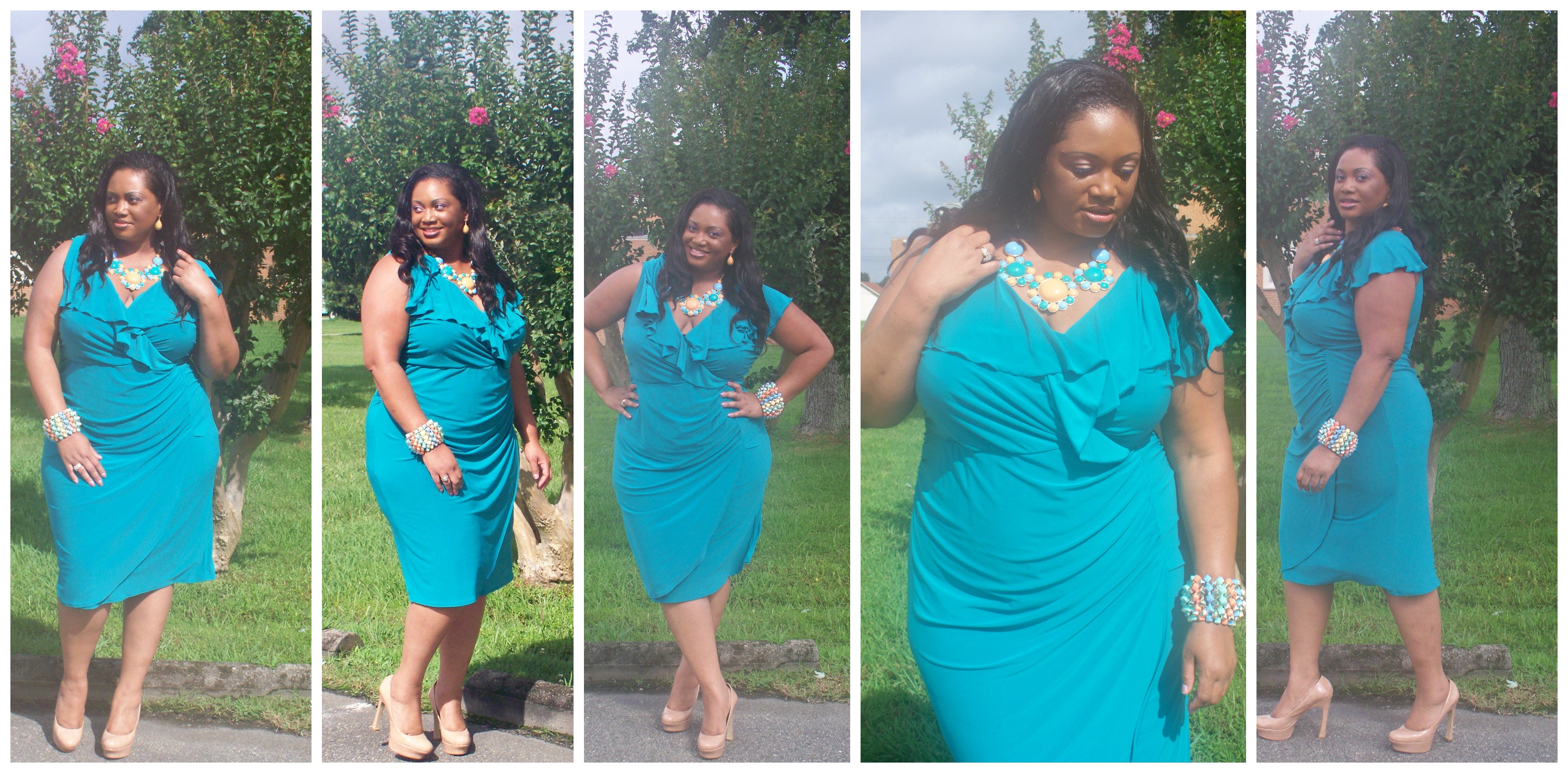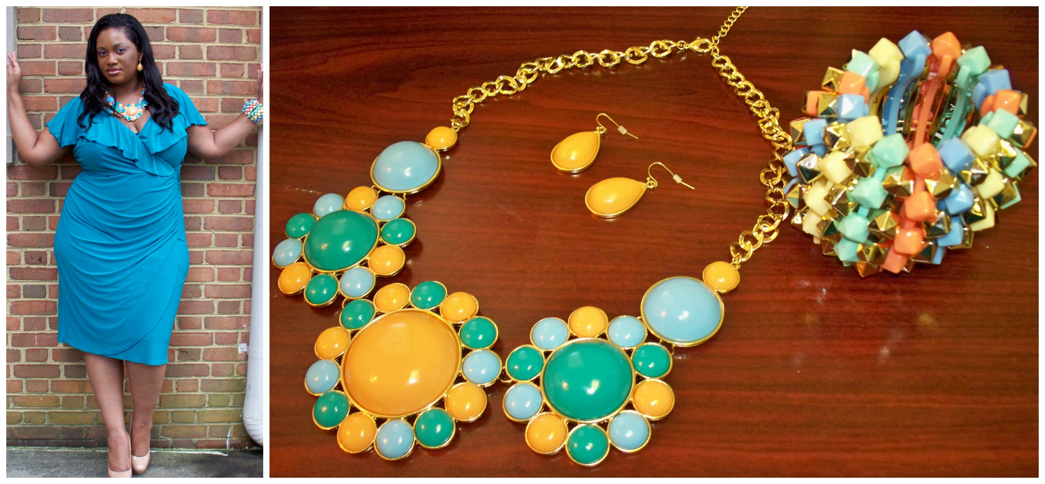 Today’s outfit post is my homage to summertime treats. I mean, who doesn’t like an ice cream cone of rainbow sherbet or some delicious sorbet. I found this necklace and earring set ($4.50) while in NYC the other week and the pastel colors in it were reminiscent to that of ice cream. I had this beautiful new dress called the Thera from IGIGI by Yuliya Racquel, $155 that I knew would set off the colors of the jewelry perfectly. The thing about IGIGI dresses are that they can be worn for both work or formal occasions. I would rock this one if hosting an event too. I didn’t realize it until after I had it on that there is ruching in the back of the dress also which really is figure flattering and detracts from flaw areas. Instead of adding pastel pumps with this ensemble I decided to go with nude shoes. Nude pumps are the way to go if you want to keep your outfit simple and they also elongate the legs too.